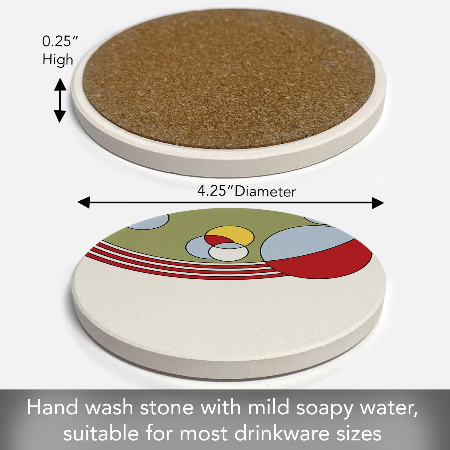 MEASUREMENTS-Each Coaster measures 4” x 4” x .31”. Size allows for a larger glass or cup to be placed on them.