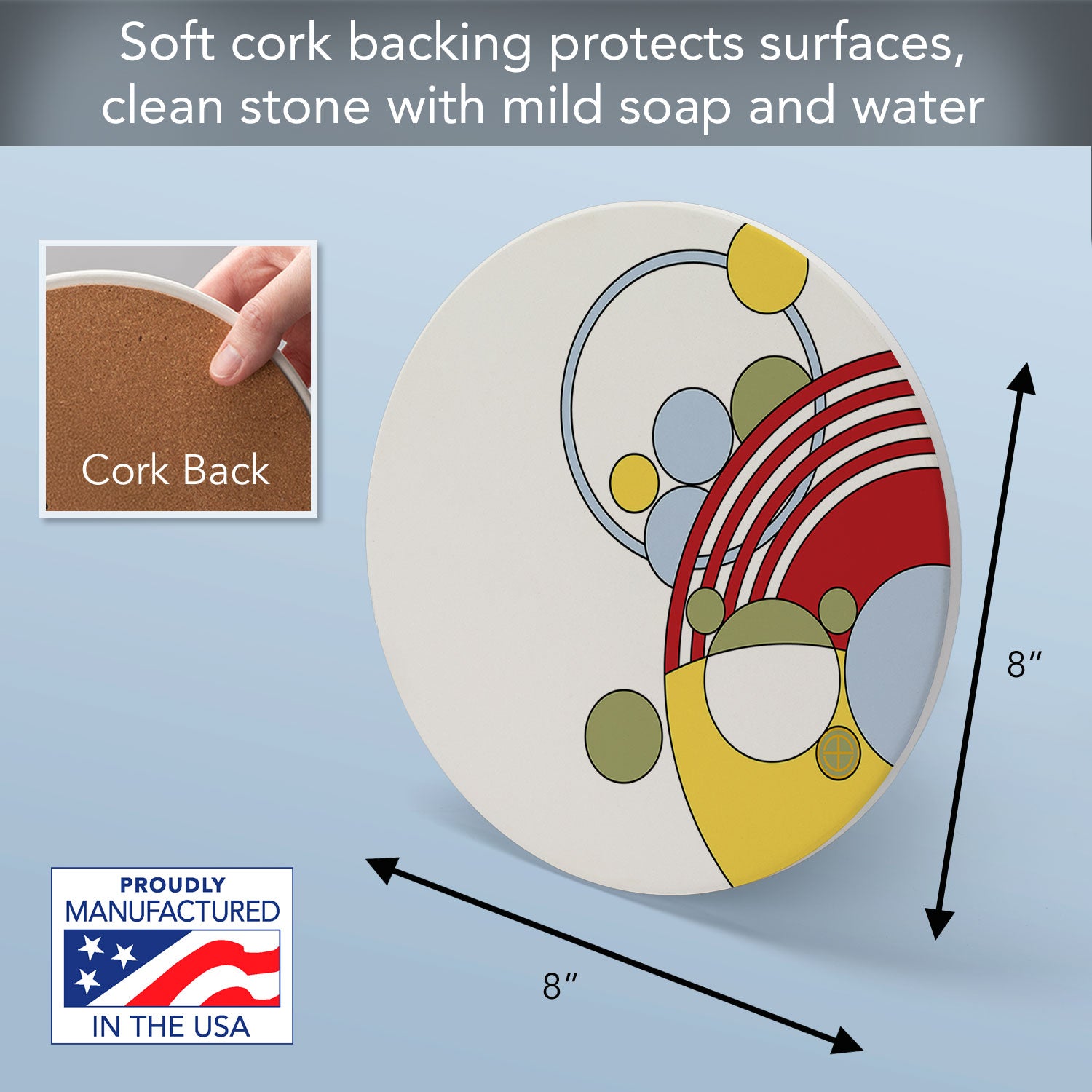 CORK BACKING-Each Trivet has an attached Non-Skid Cork Backing. Cork backing assists in keeping the Trivet stabilized when in use. Cork backing also protects your surfaces from scratches and stains.