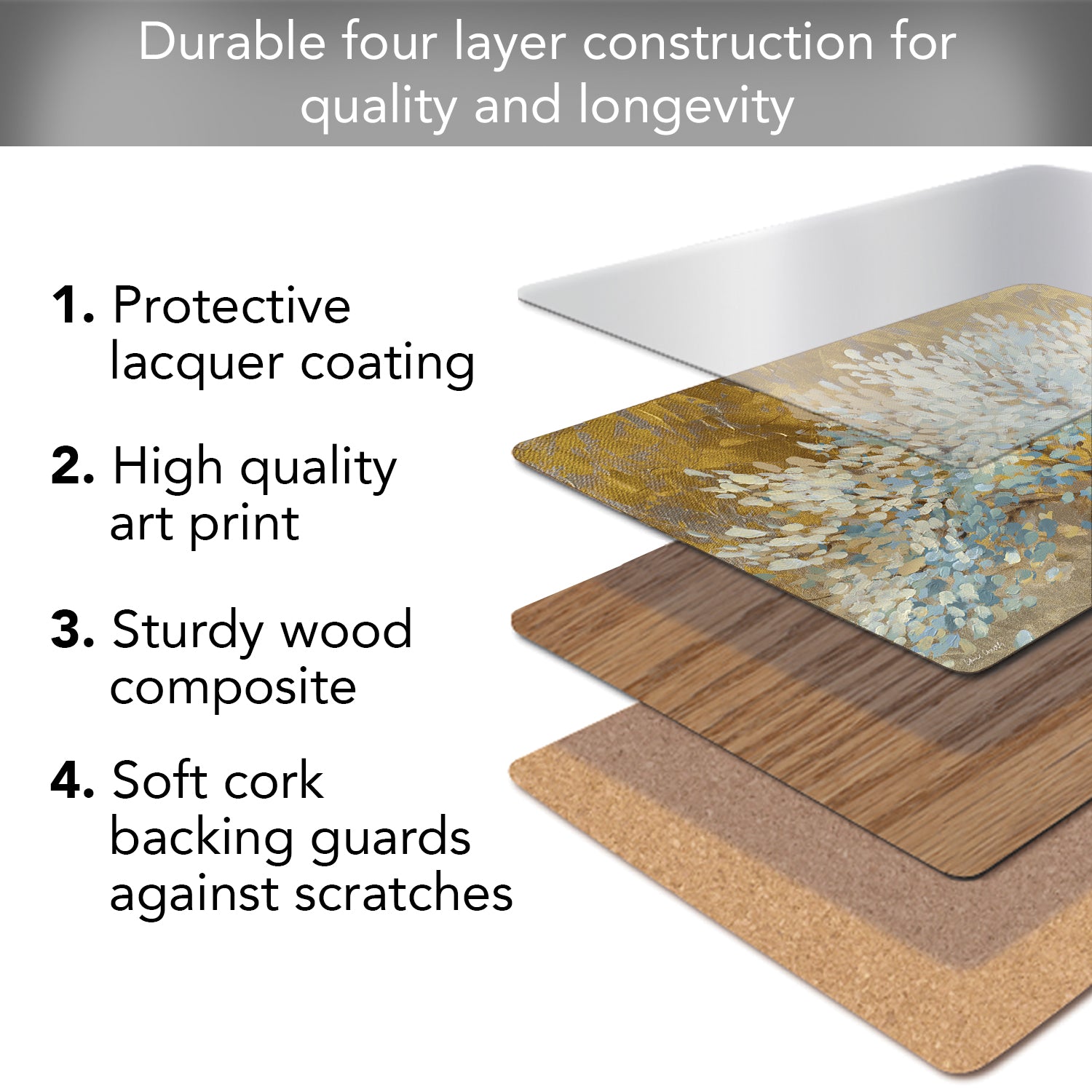LAYERED CONSTRUCTION- Made with layered construction. The surface of the mats is coated with protective lacquer. Heat resistant to 212 degrees Fahrenheit. The art is laminated to a wood composite layer. A soft cork backing protects the table surface from scratches.