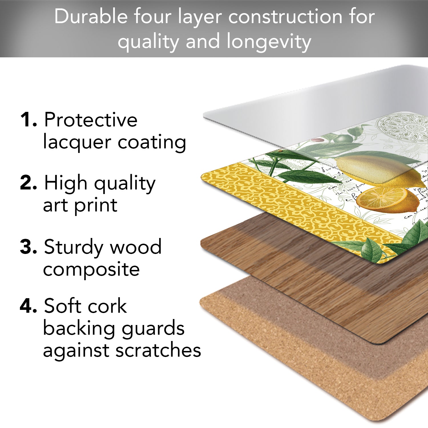 LAYERED CONSTRUCTION- Made with layered construction. The surface of the mats is coated with protective lacquer. Heat resistant to 212 degrees Fahrenheit. The art is laminated to a wood composite layer. A soft cork backing protects the table surface from scratches.