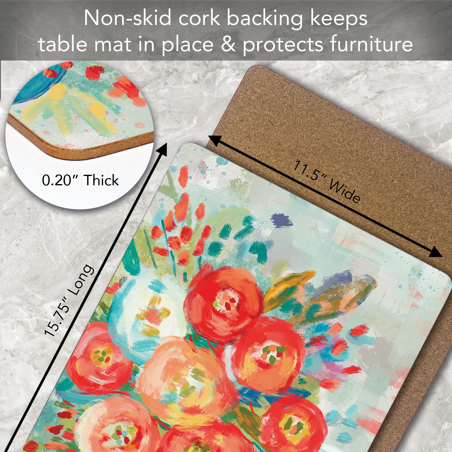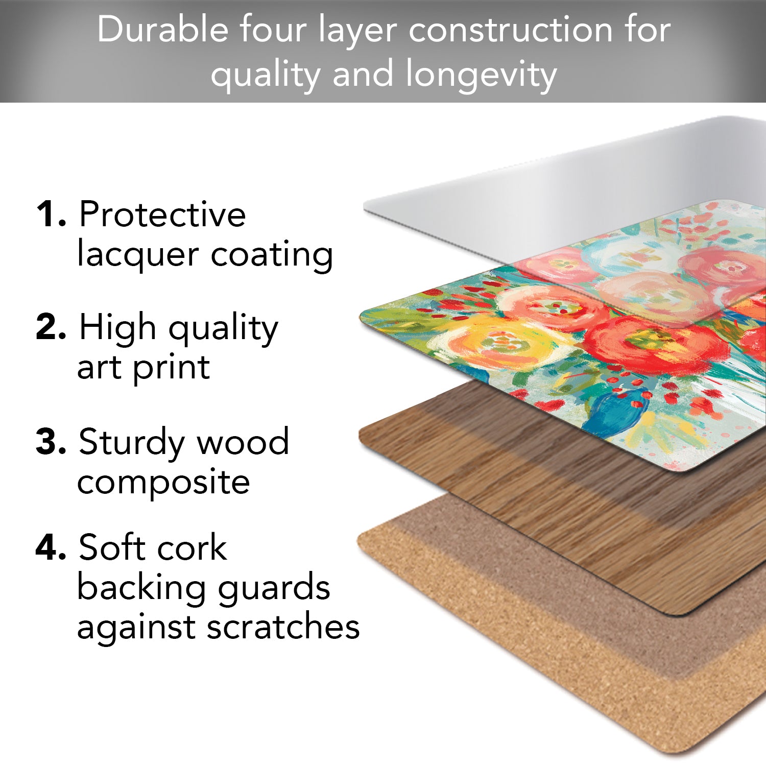 LAYERED CONSTRUCTION- Made with layered construction. The surface of the mats is coated with protective lacquer. Heat resistant to 212 degrees Fahrenheit. The art is laminated to a wood composite layer. A soft cork backing protects the table surface from scratches.