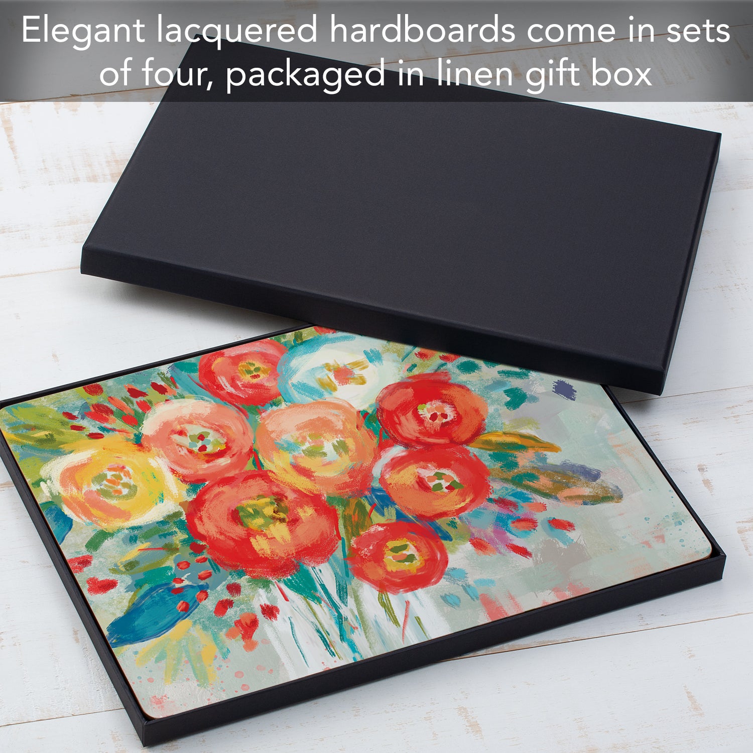 ELEGANCE- Set of 4 Decorative Placemats. Hardboard with a Cork Backing. Placemats arrive in elegant gift box that can also be used to store them. Add elegance and style to your kitchen or dining area with these functional placemats.