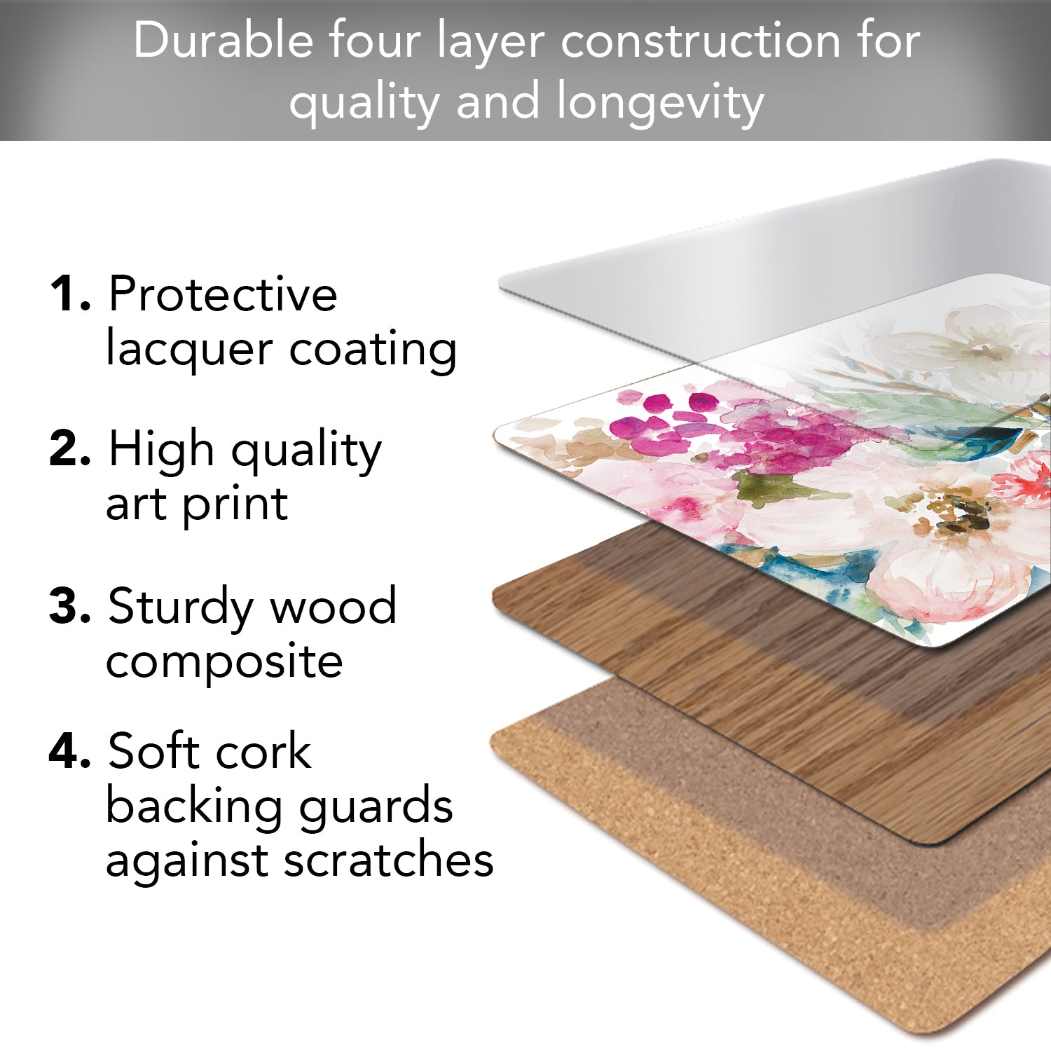 LAYERED CONSTRUCTION- Made with layered construction. The surface of the mats is coated with protective lacquer. Heat resistant to 212 degrees Fahrenheit. The art is laminated to a wood composite layer. A soft cork backing protects the table surface from scratches.