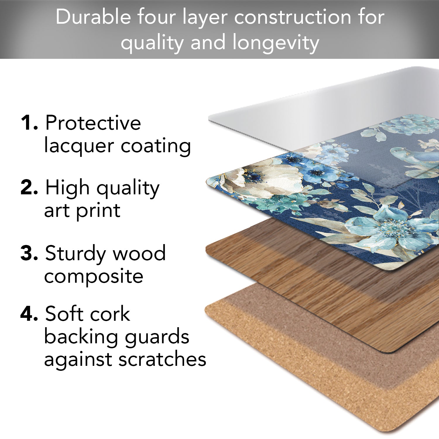 LAYERED CONSTRUCTION- Made with layered construction. The surface of the mats is coated with protective lacquer. Heat resistant to 212 degrees Fahrenheit. The art is laminated to a wood composite layer. A soft cork backing protects the table surface from scratches.