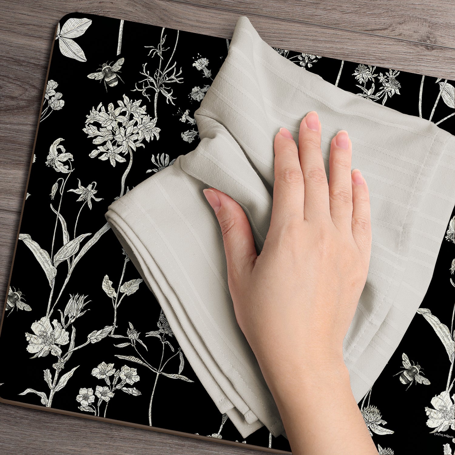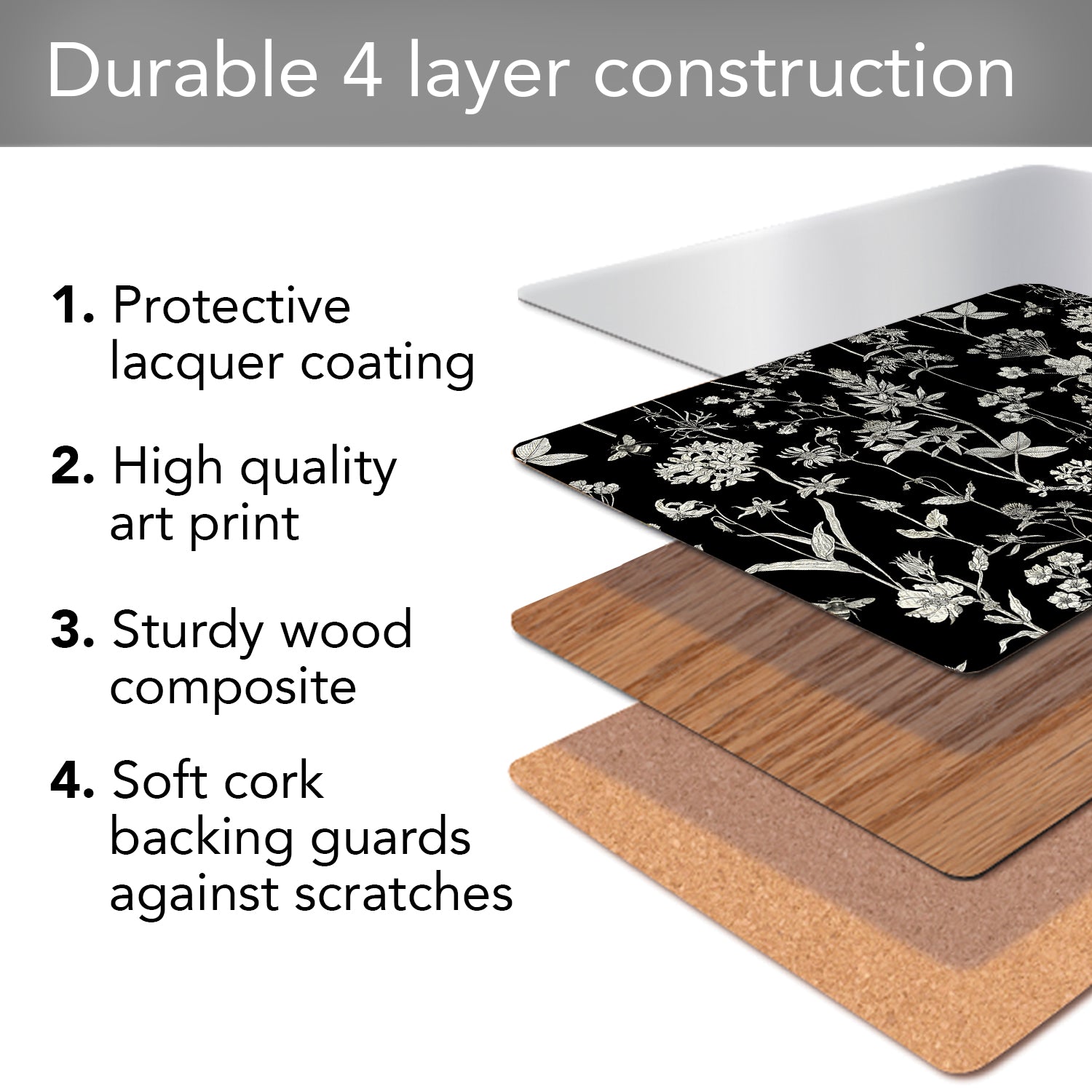 LAYERED CONSTRUCTION- Made with layered construction. The surface of the mats is coated with protective lacquer. Heat resistant to 212 degrees Fahrenheit. The art is laminated to a wood composite layer. A soft cork backing protects the table surface from scratches.