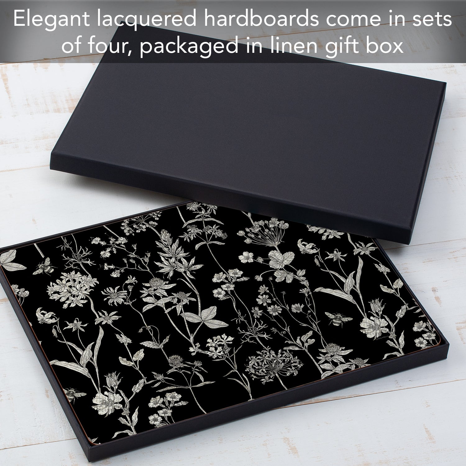 ELEGANCE- Set of 4 Decorative Placemats. Hardboard with a Cork Backing. Placemats arrive in elegant gift box that can also be used to store them. Add elegance and style to your kitchen or dining area with these functional placemats.