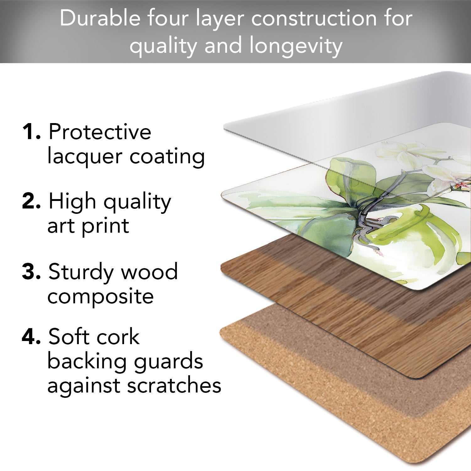 LAYERED CONSTRUCTION- Made with layered construction. The surface of the mats is coated with protective lacquer. Heat resistant to 212 degrees Fahrenheit. The art is laminated to a wood composite layer. A soft cork backing protects the table surface from scratches.