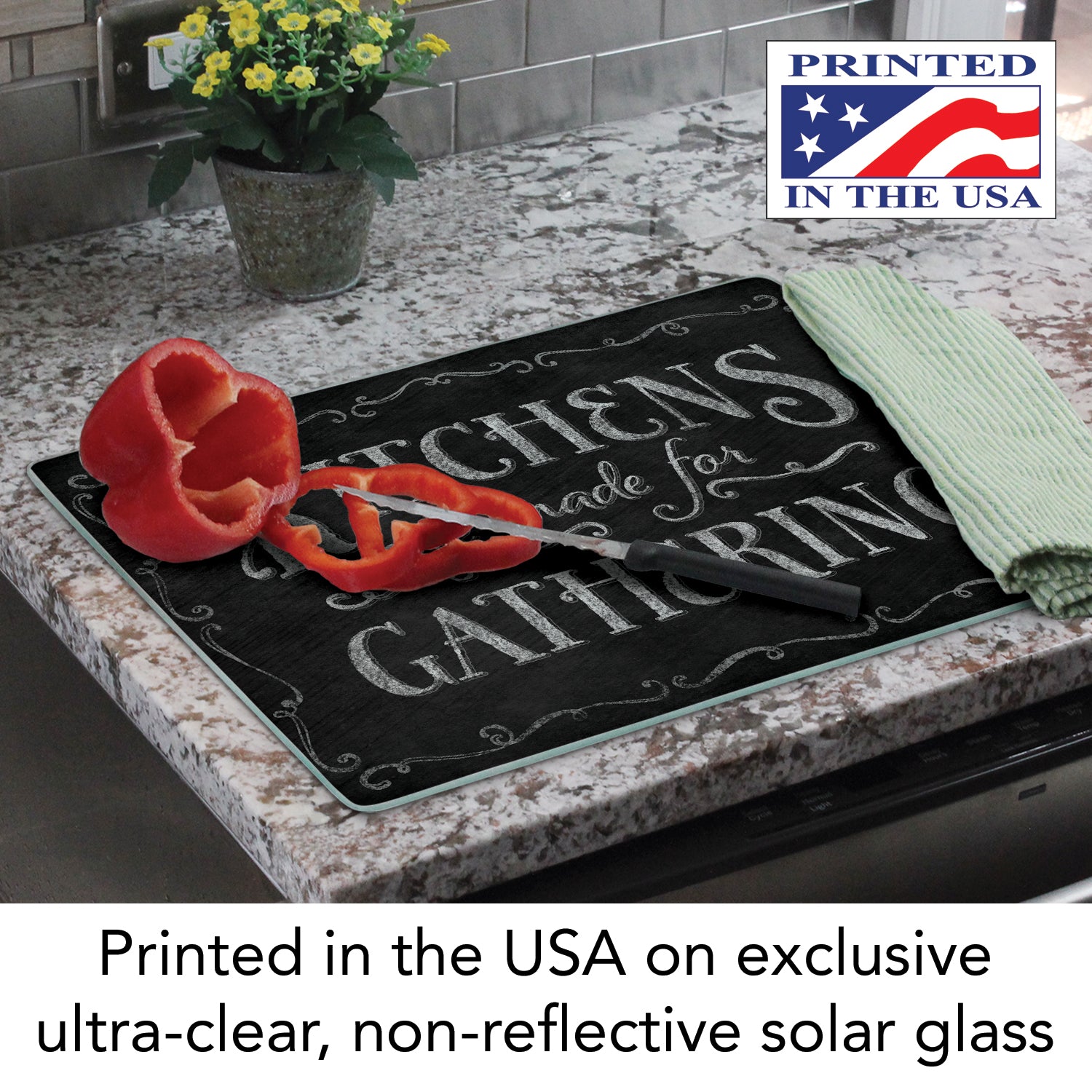 - GLASS CUTTING BOARD-This attractive Cutting Board works great for food preparation, cutting and serving. Manufactured in the USA with durable 3mm Tempered Glass.