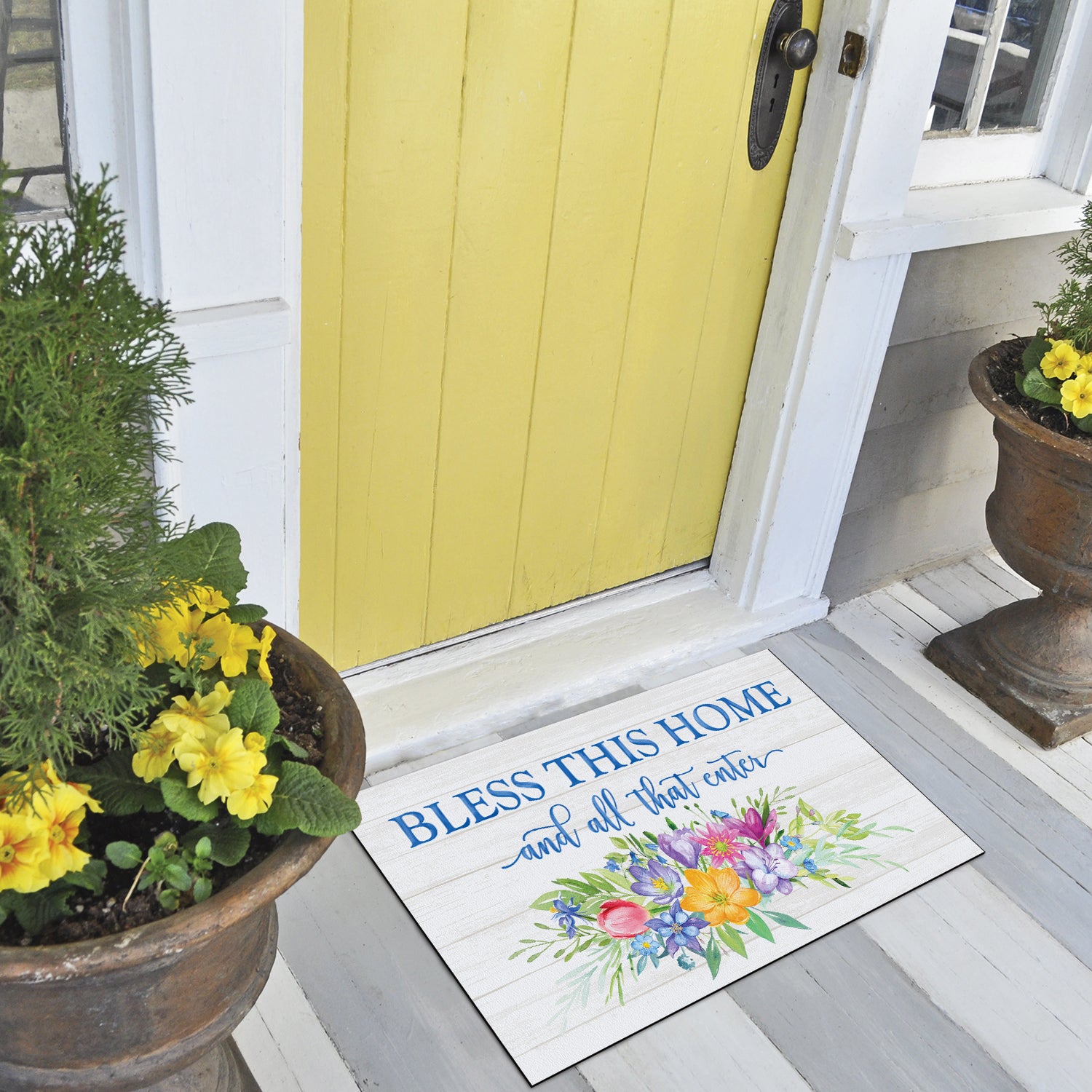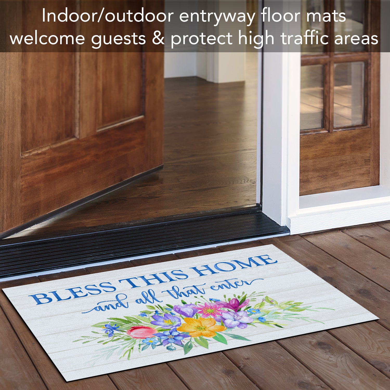INDOOR/OUTDOOR- Entryway Floor Mat is perfect to welcome guests at the front door as well as protecting high traffic areas inside your home. Constructed of a non-woven polyester blend and rubber backing. Material holds color and vibrancy longer than usual mats.