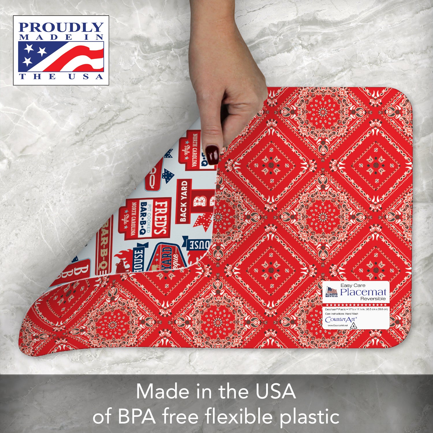 REVERSIBLE-Each Placemat features a coordinating design printed on the opposite side. Placemats are constructed of BPA and PVC free flexible plastic.
