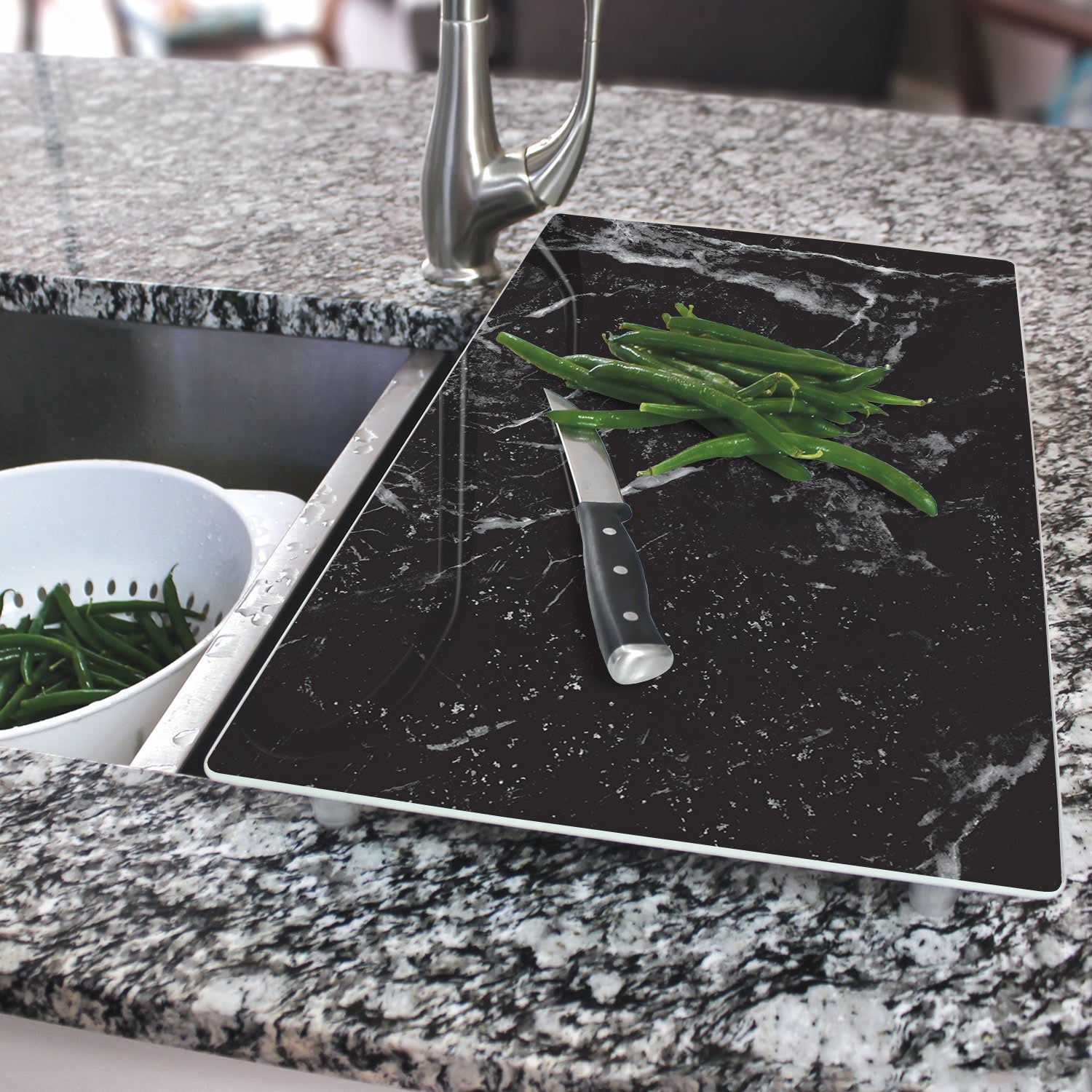 DURABLE- Constructed of 5mm Tempered Glass that works great for chopping, dicing, and prepping foods. Silicone capped feet are attached to bottom of the board.