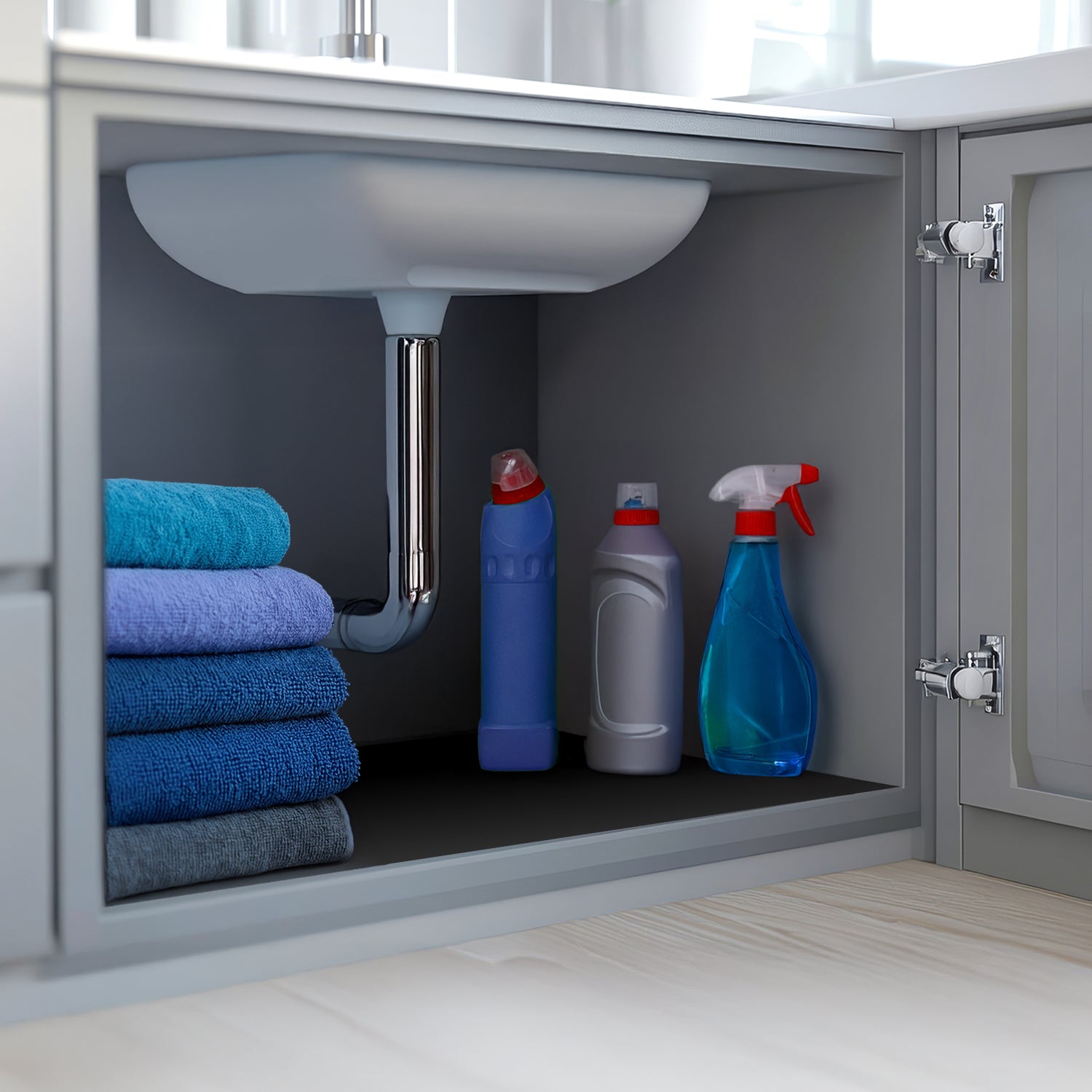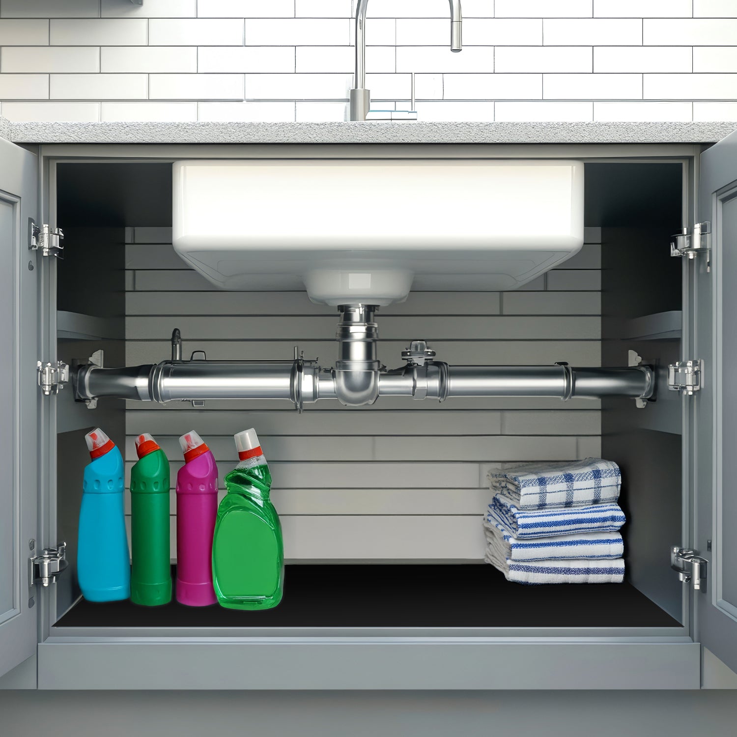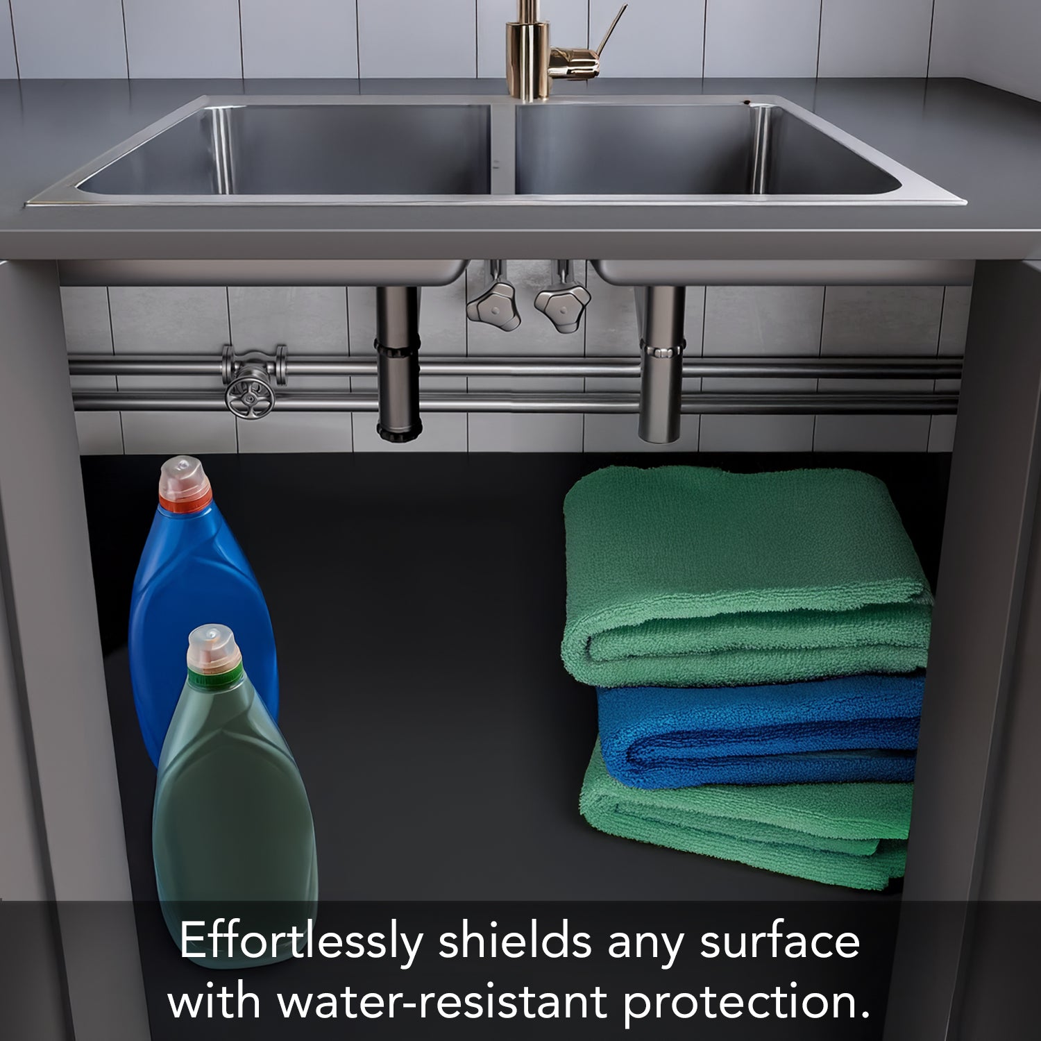 - UNDER SINK PROTECTION- Under Sink Liner protects under sink areas from spills or leaks. Prevents rust rings from can bottoms. Keeps cleaning product spills off your cabinet bottom.