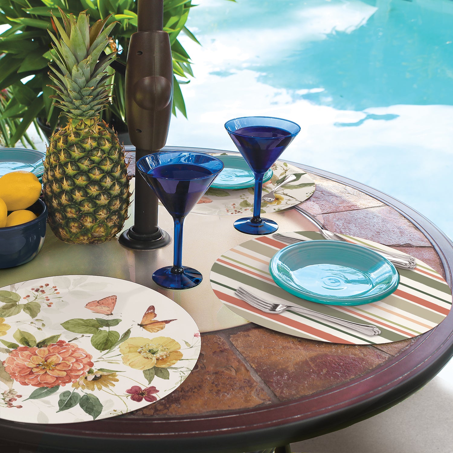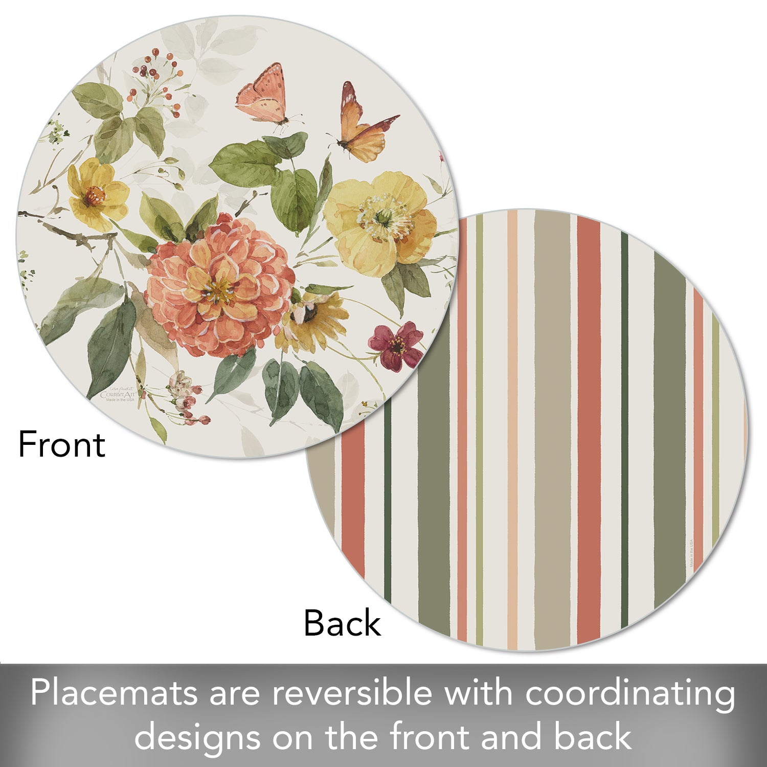 REVERSIBLE-Placemats are reversible, featuring different coordinating designs on both the front and back of each mat. Attractive coordinating designs are great for everyday meals, parties and outdoor entertaining.