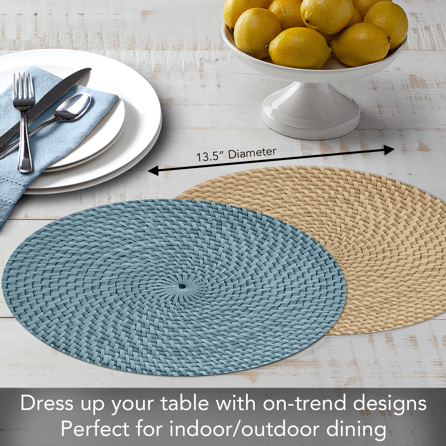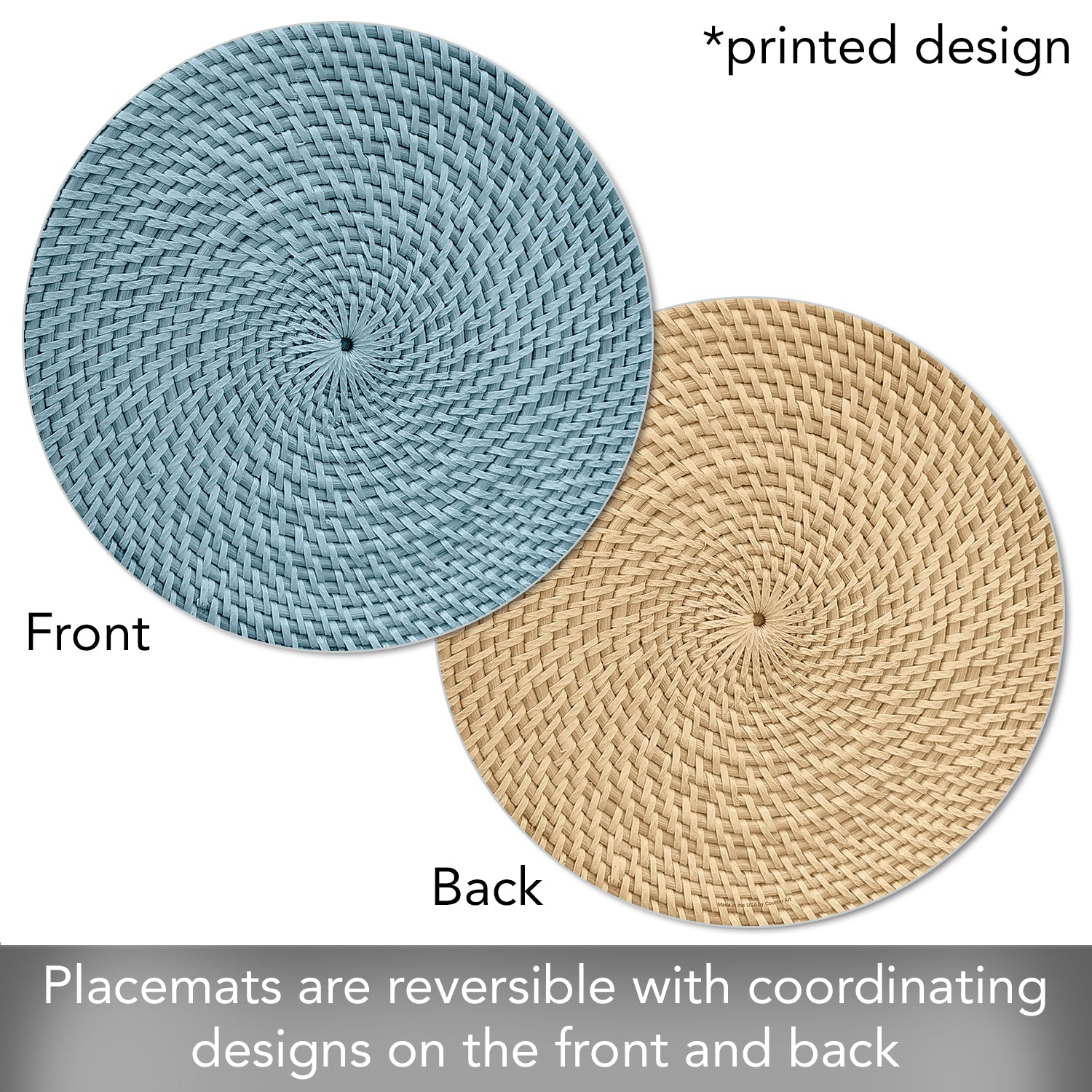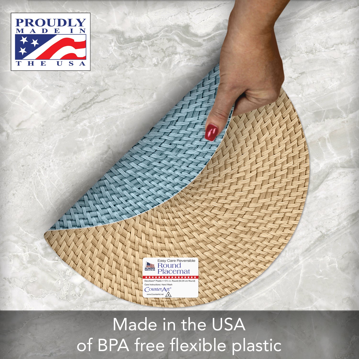 CounterArt Blue Natural Faux Basketweave 4 Pack Round Reversible Easy Care Flexible Plastic Placemats Made in The USA Reversible Flexible Easily Wipes Clean