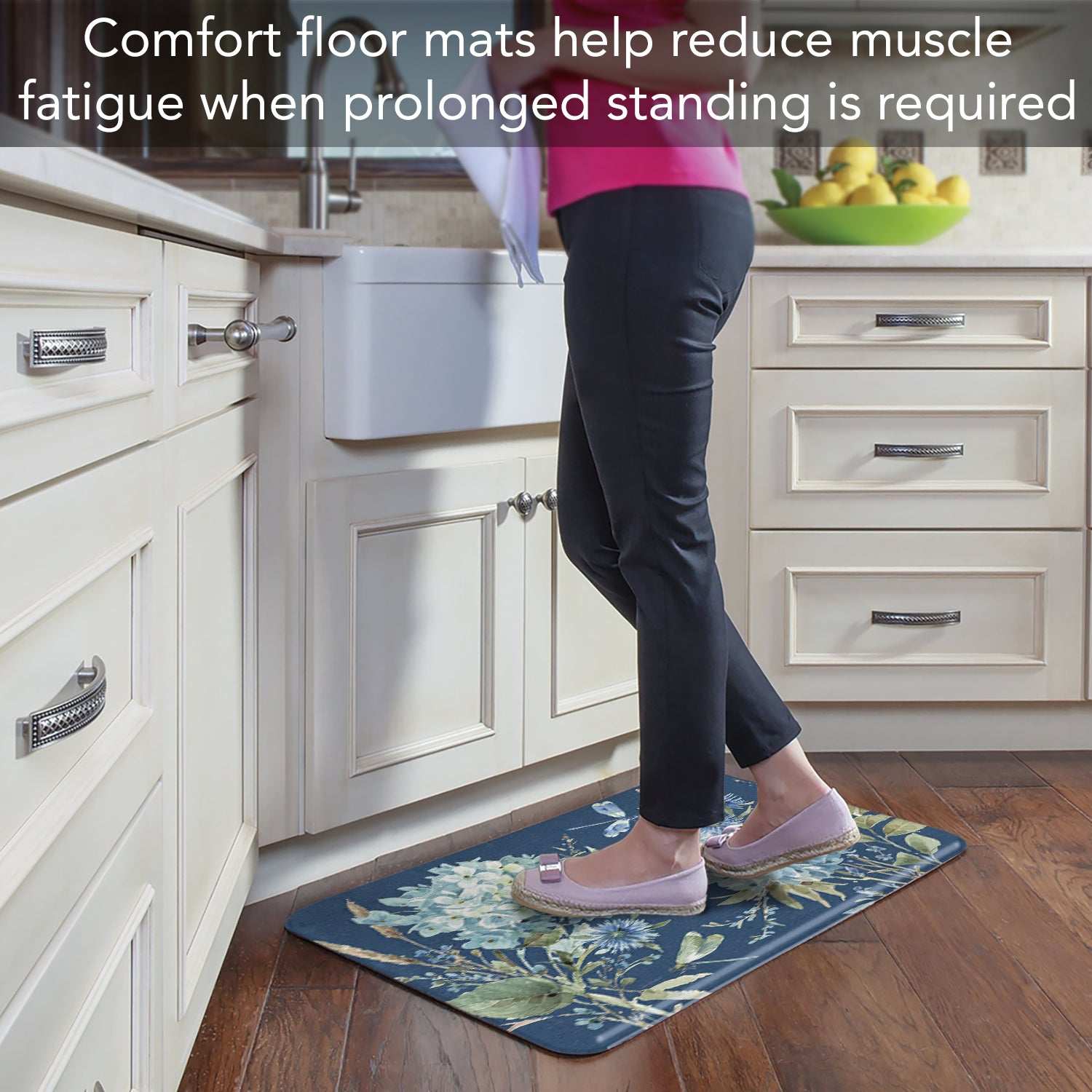 ALL FLOOR TYPES-Vinyl textured backing allows the Floor Mat to be placed on any type of floor, whether it be tile, wood, or carpet. These Comfort Mats are easy to maintain. Wipe with damp cloth or spray off lightly with garden hose and lay flat to dry.