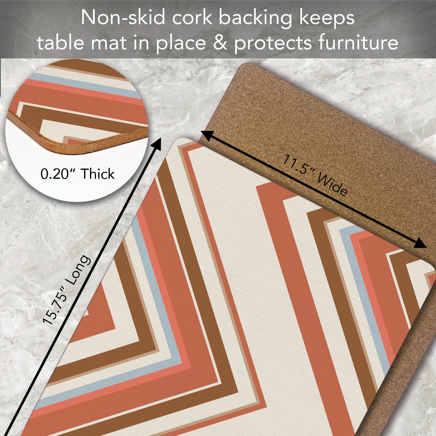 LAYERED CONSTRUCTION- Made with layered construction. The surface of the mats is coated with protective lacquer. Heat resistant to 212 degrees Fahrenheit. The art is laminated to a wood composite layer. A soft cork backing protects the table surface from scratches.
