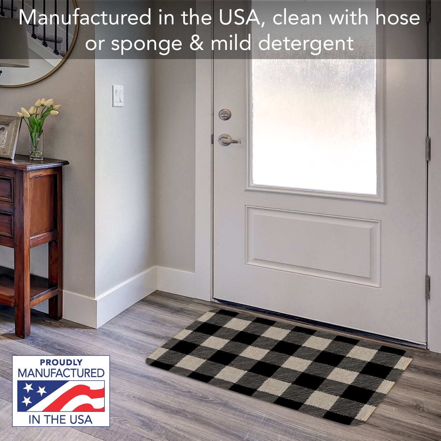 DURABLE & EASY TO CLEAN- Durable Woven Polyester surface with stitched edging has a look of natural linen. Non-skid rubber backing keeps the Floor Mat in place. Floor Mat is easy to clean with mild soap and water or by spraying off with garden hose then lying flat to dry.