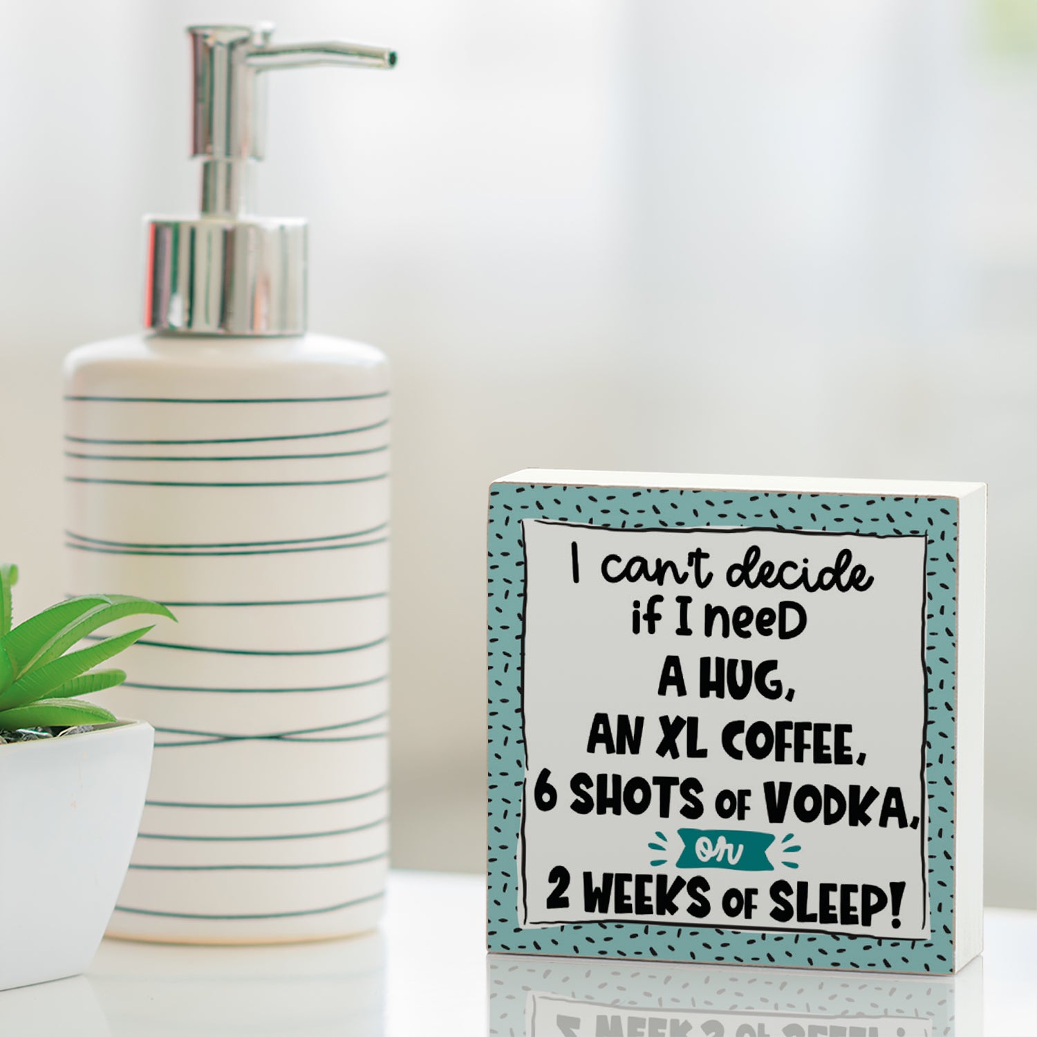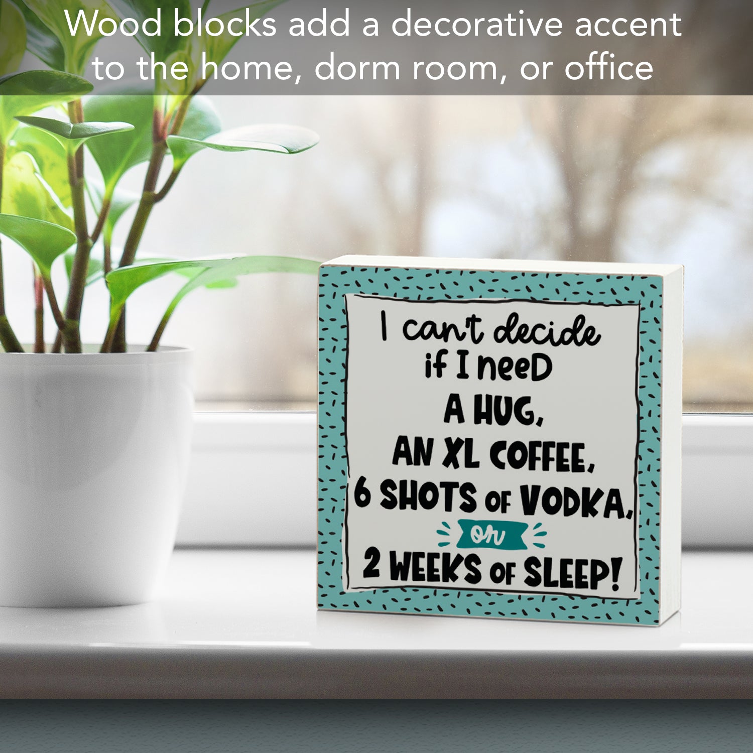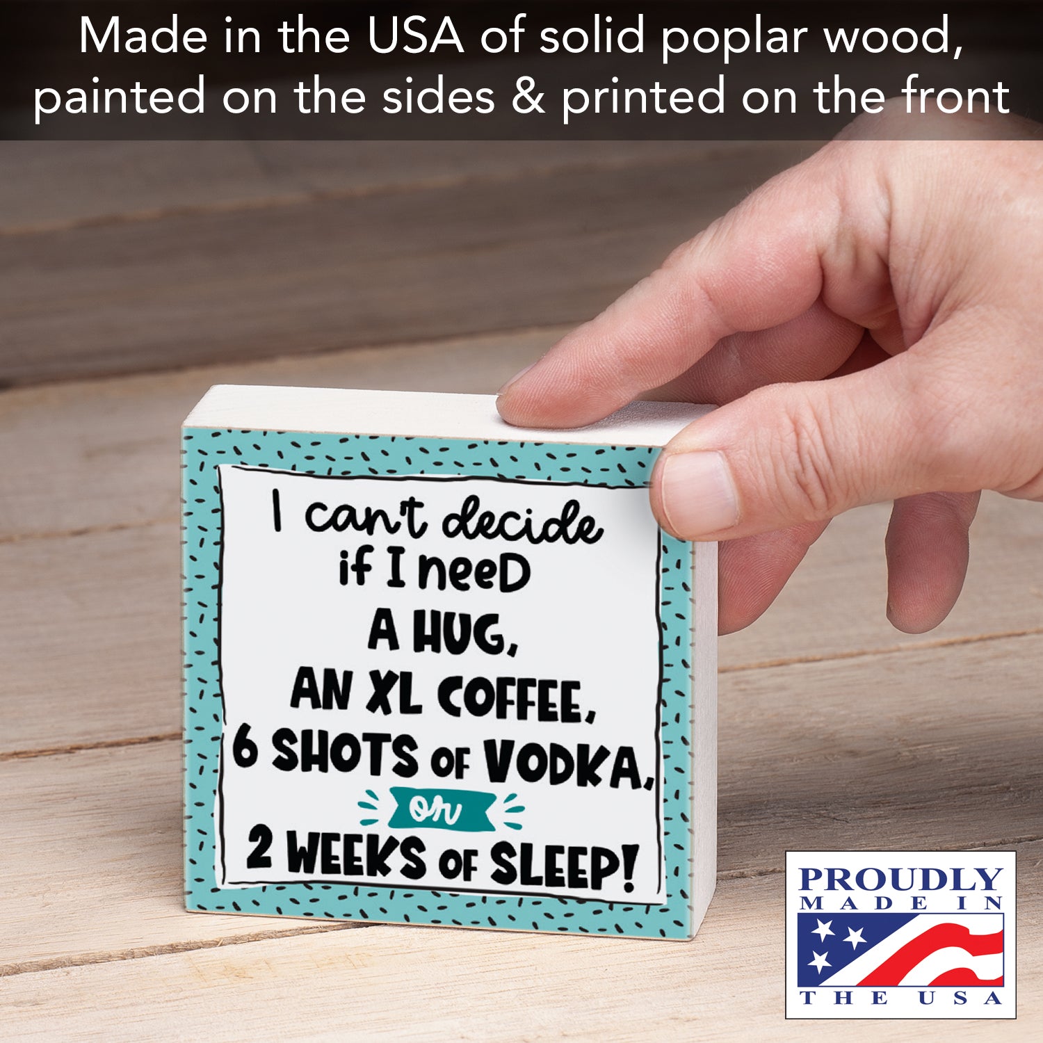 "Can't Decide, Hug, Coffee, Or Vodka" Artistic Freestanding Solid Wood Block Sign Made in the USA 3.75” Square
