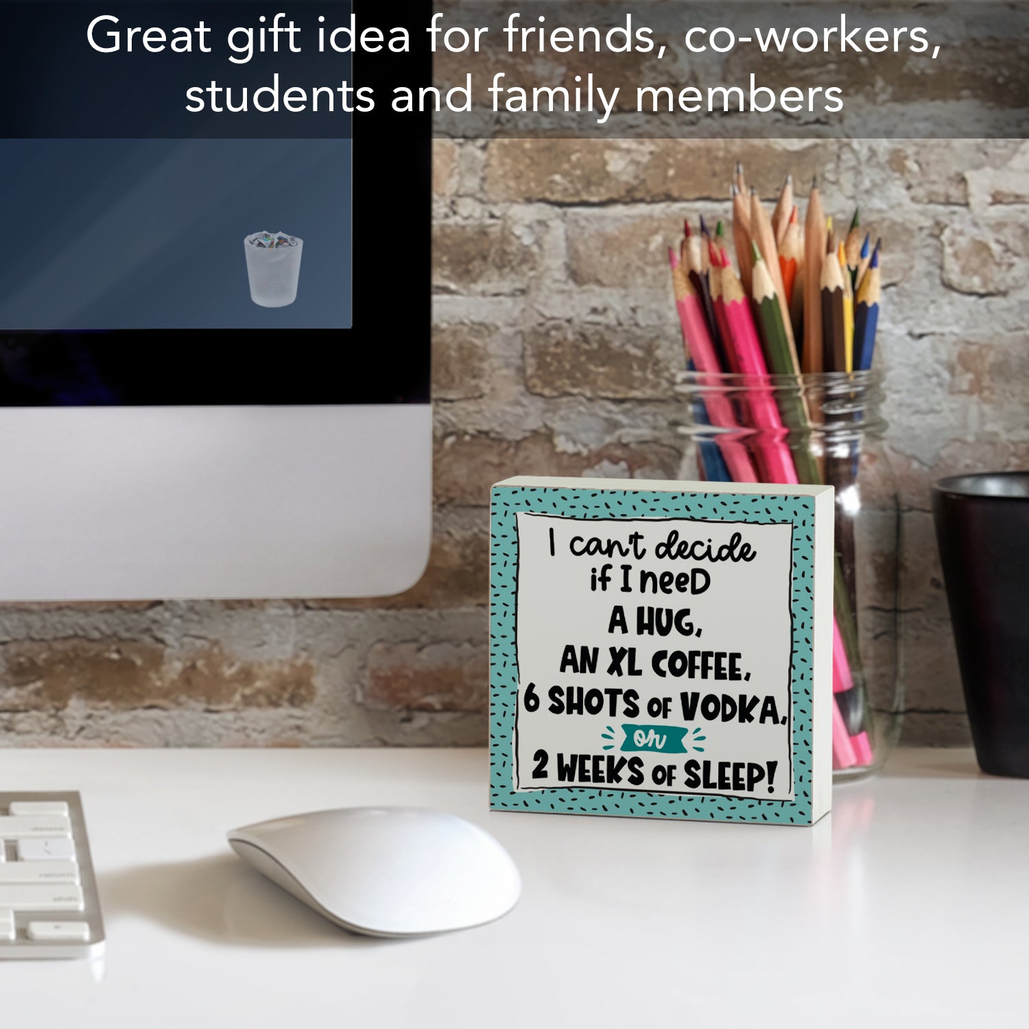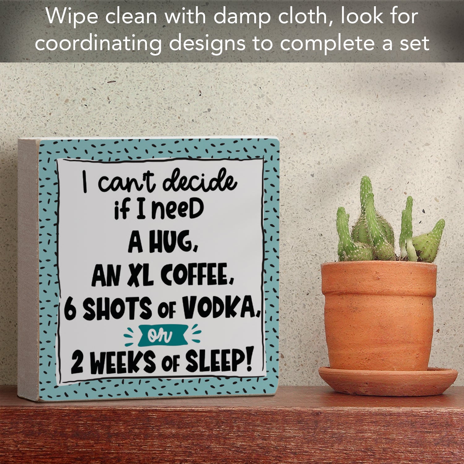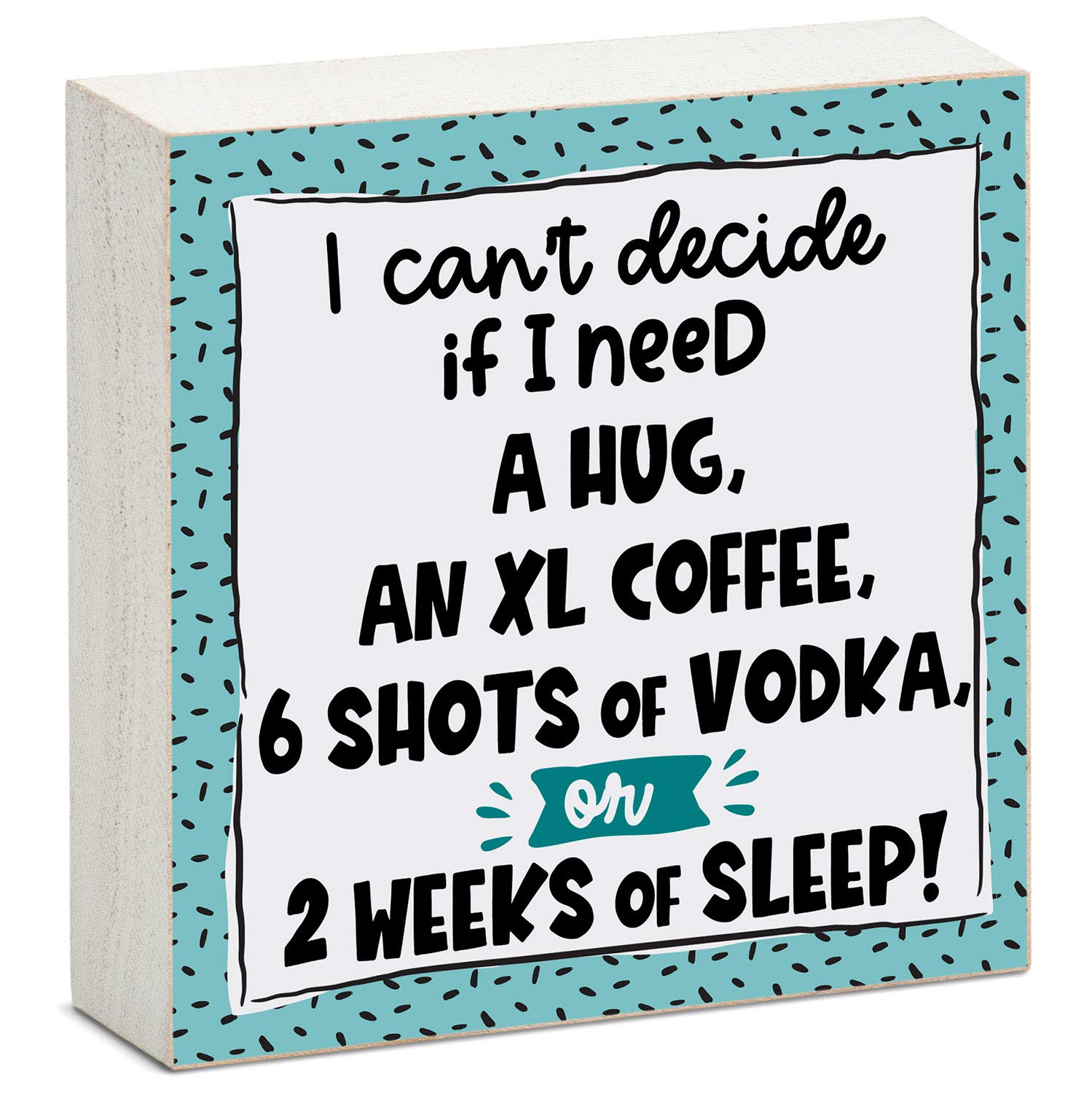 "Can't Decide, Hug, Coffee, Or Vodka" Artistic Freestanding Solid Wood Block Sign Made in the USA 3.75” Square