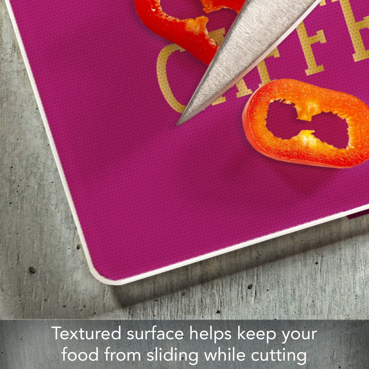 FEATURES-Surface of Cutting Board is slightly textured to help keep foods stable as they are being chopped and diced. Rubber Non-Skid feet on bottom of the board protects your surfaces from scratches and stains.