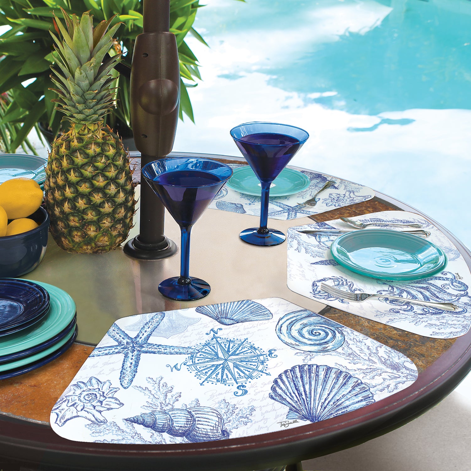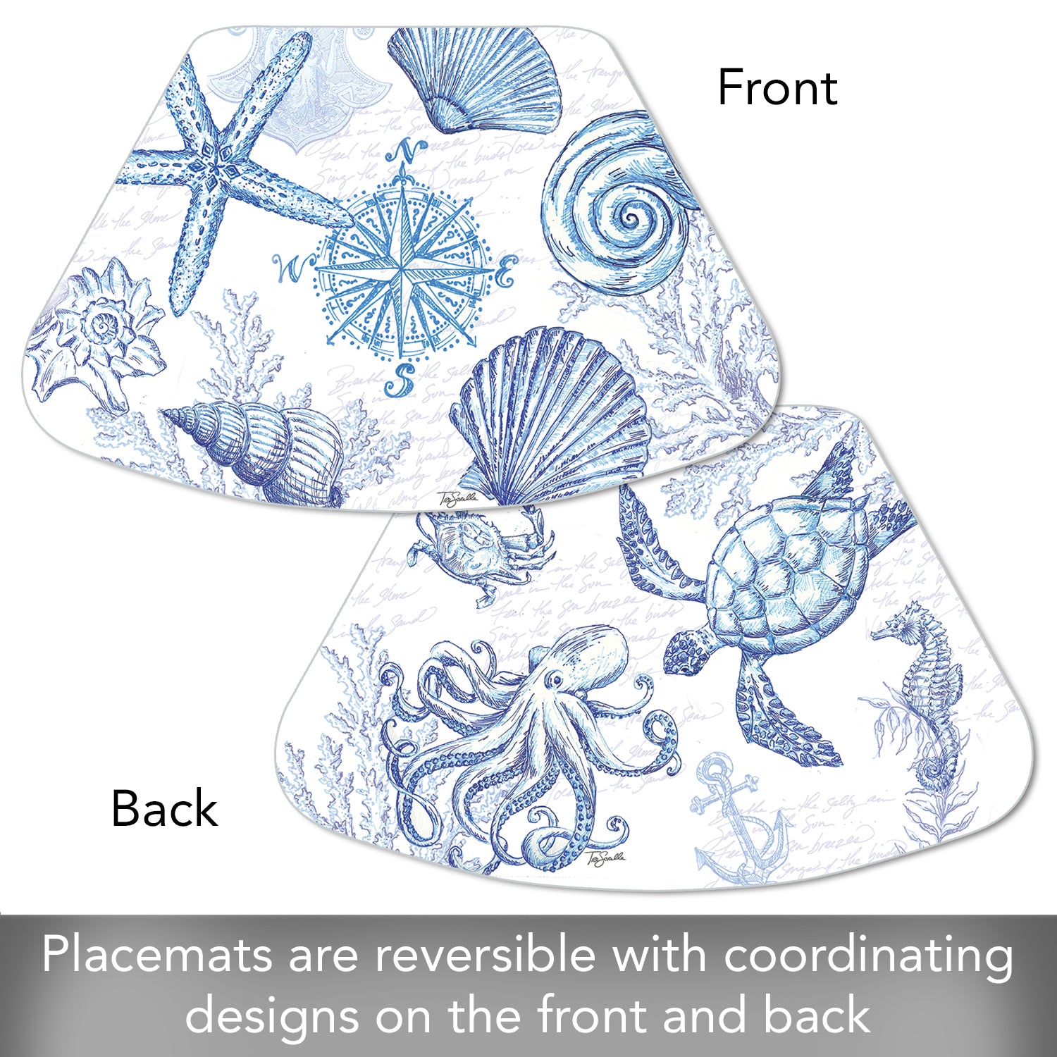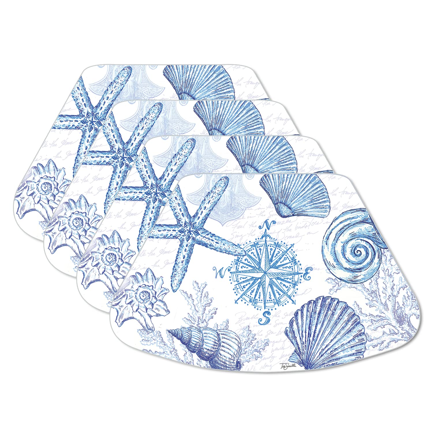 CounterArt Coastal Sketch 4 Pack Wedge Shaped Reversible Easy Care Placemats Made in the USA