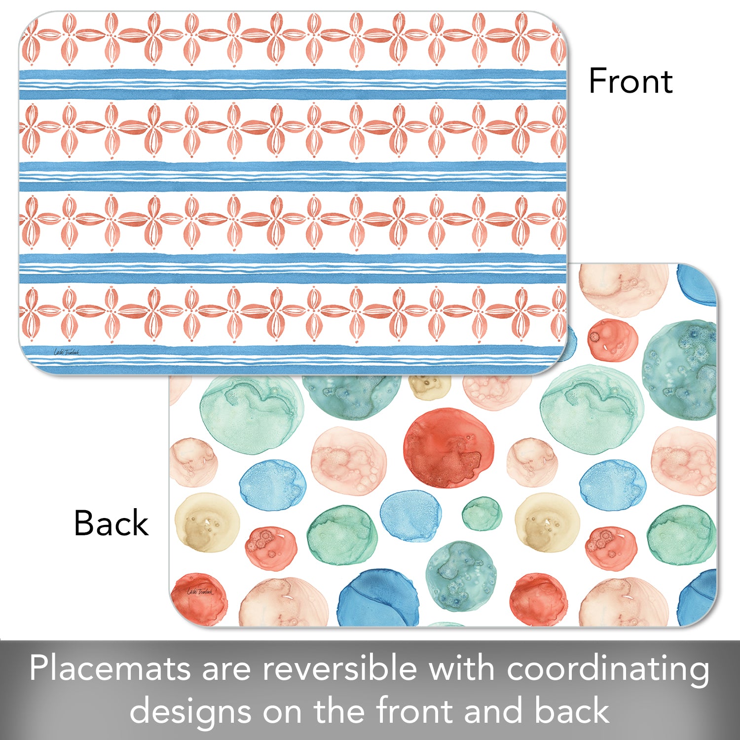 REVERSIBLE-Each Placemat features a coordinating design printed on the opposite side. Placemats are constructed of BPA and PVC free flexible plastic.