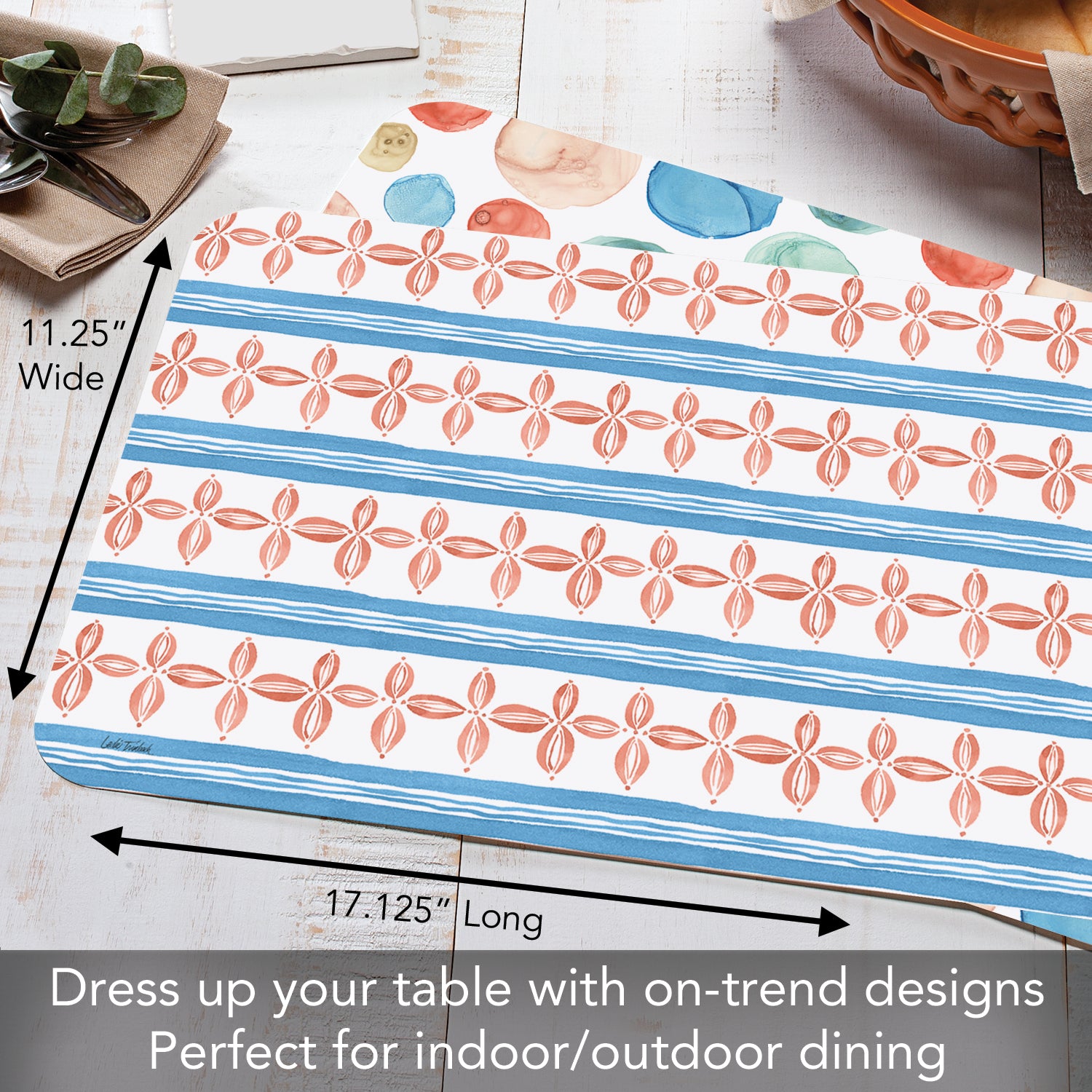 MEASUREMENTS-Each Placemat measures 17.13” x 11.25” x 0.15”. Placemats are an easy and inexpensive way to change the look of your dining space. Check out our Seasonal designs to decorate for the Holidays.