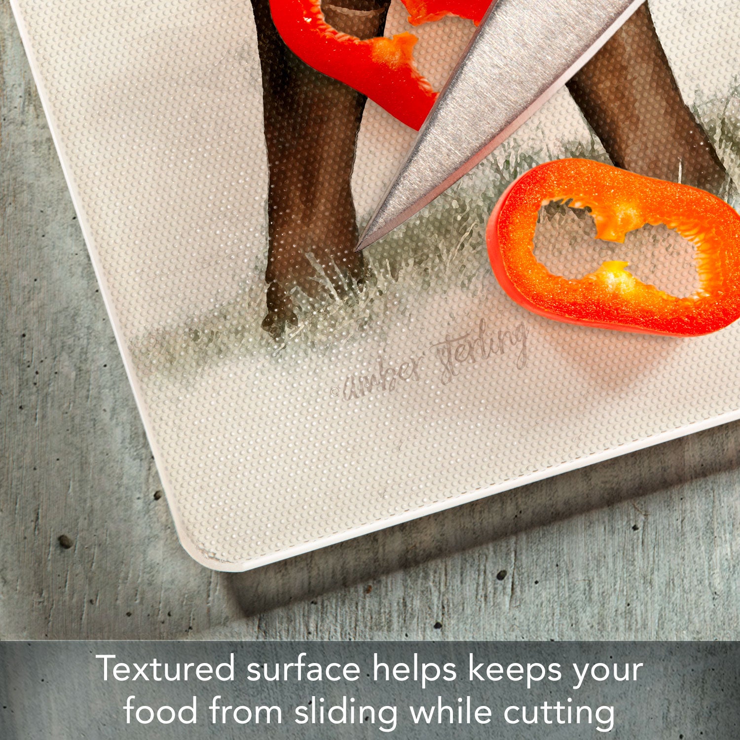- FEATURES- Surface of Cutting Board is slightly textured to help keep foods stable as they are being chopped and diced. Rubber Non-Skid feet on bottom of the board protects your surfaces from scratches and stains.