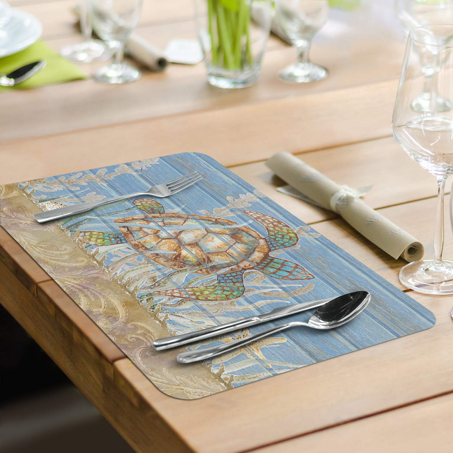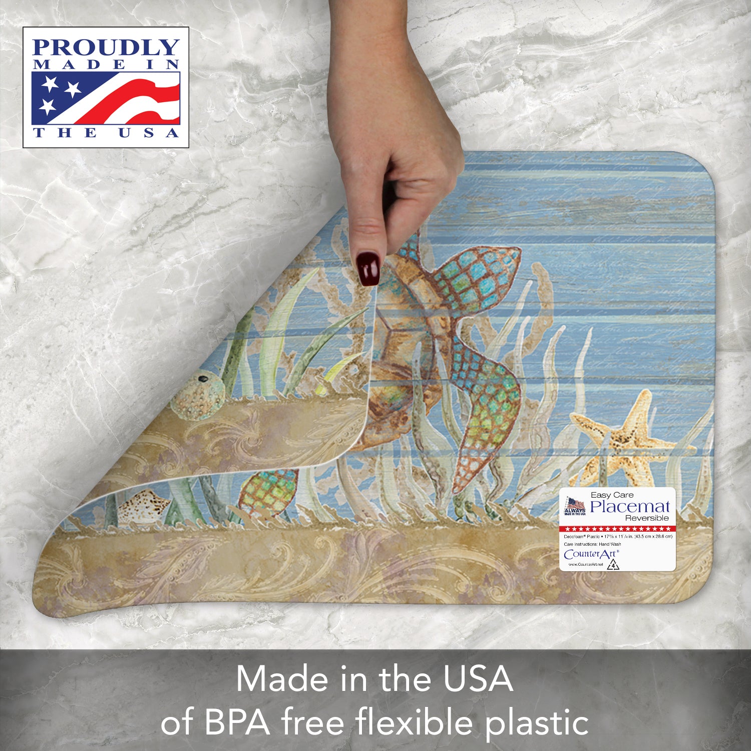 REVERSIBLE-Each Placemat features a coordinating design printed on the opposite side. Placemats are constructed of BPA and PVC free flexible plastic.