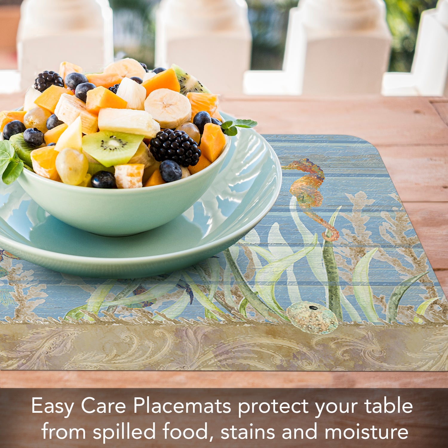 PROTECTS SURFACES-Placemats protect your table or countertop from spilled food, scratches, or stains. Placemat material prevents liquids from soaking through to your surfaces which may cause water rings or damage.