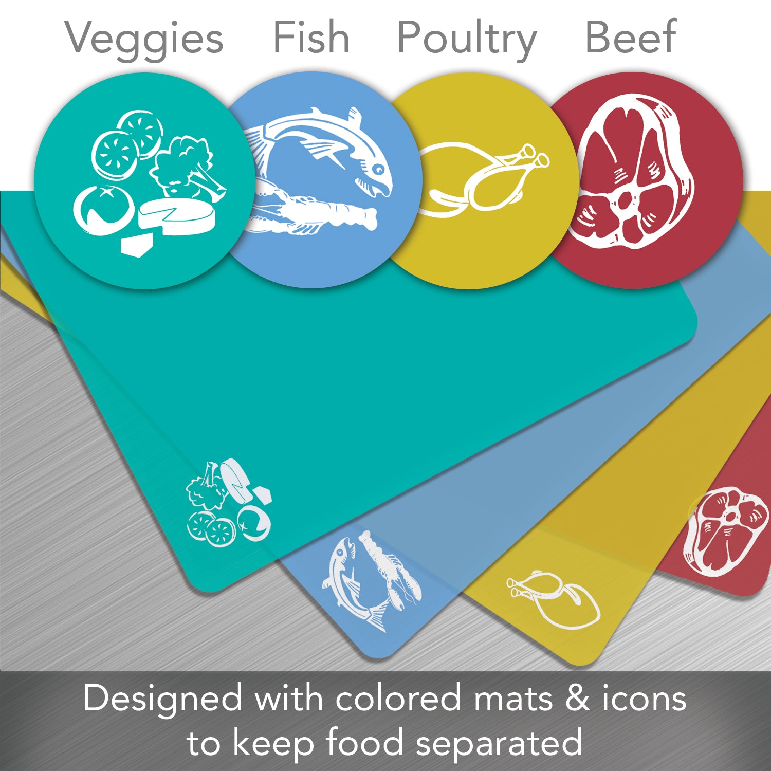 - COLOR CODED- Each brightly colored mat indicates food type use by a food icon in the corner of the mat for meat, poultry, fish and vegetables or fruits.