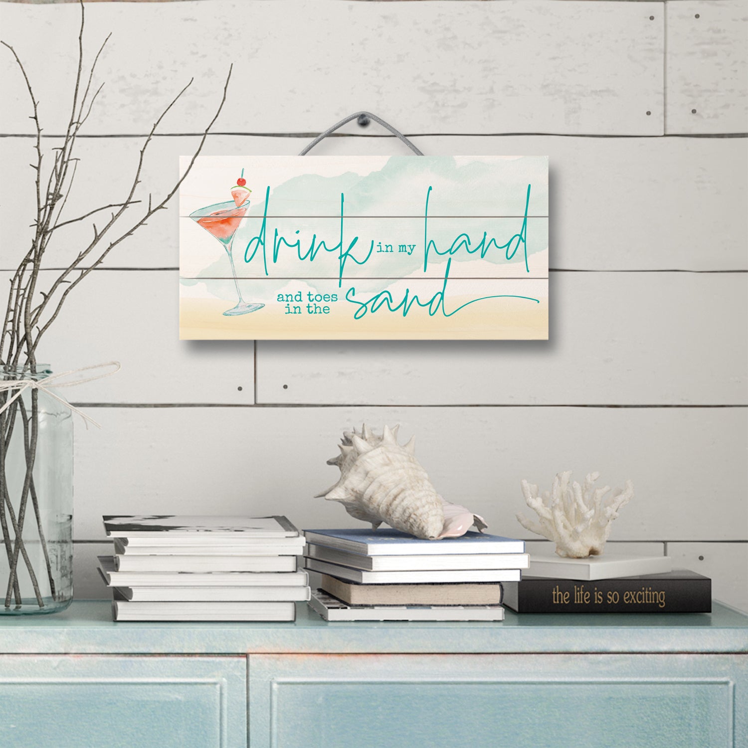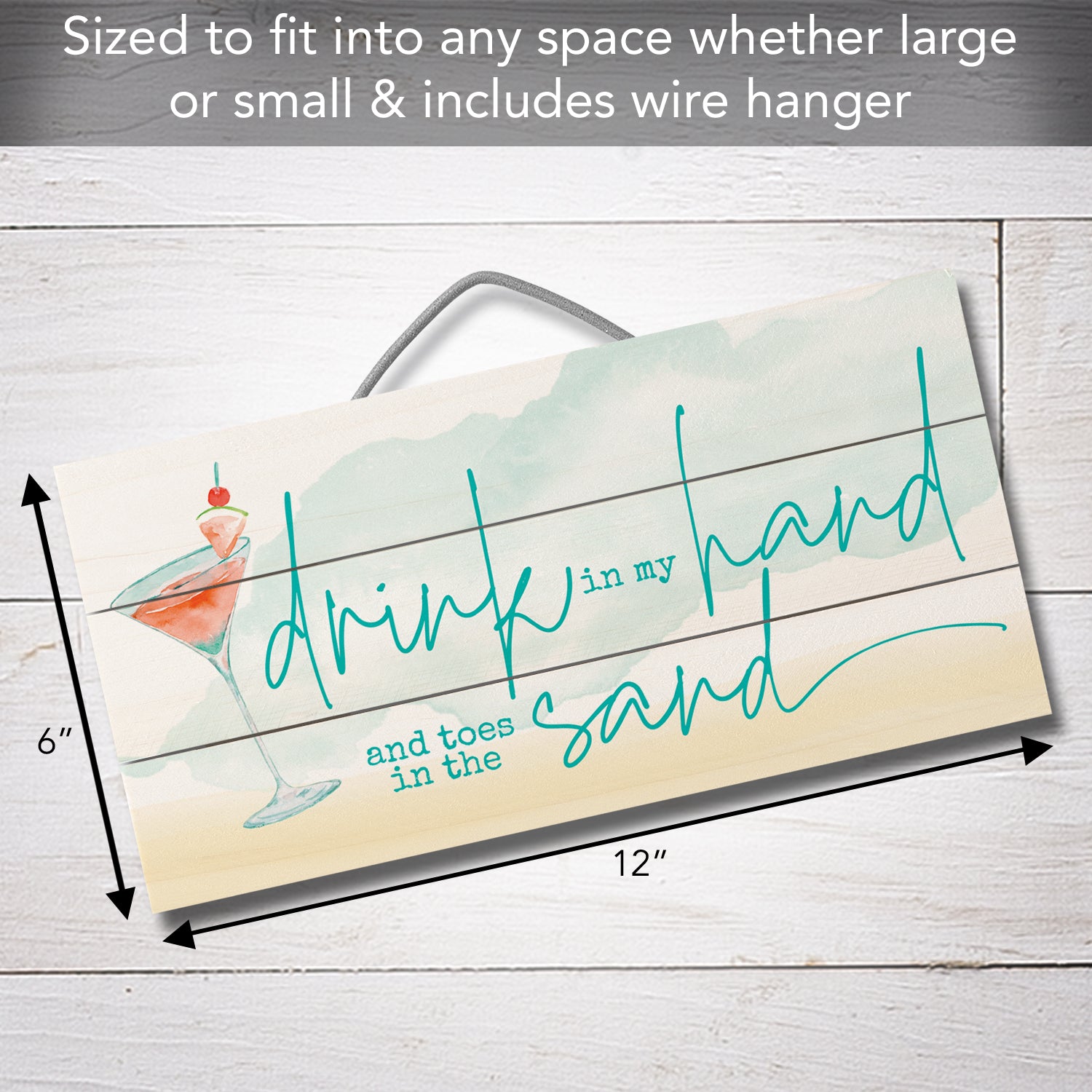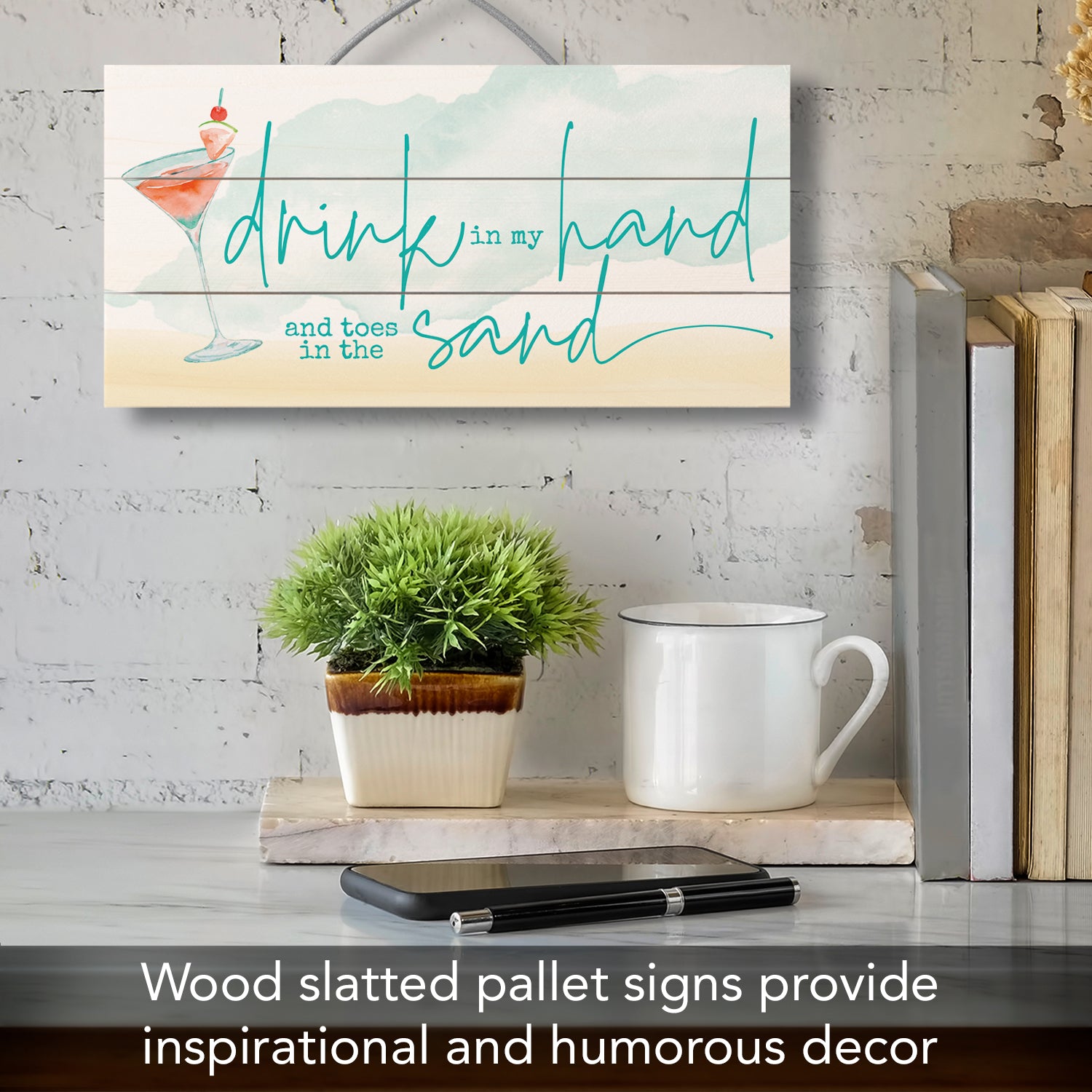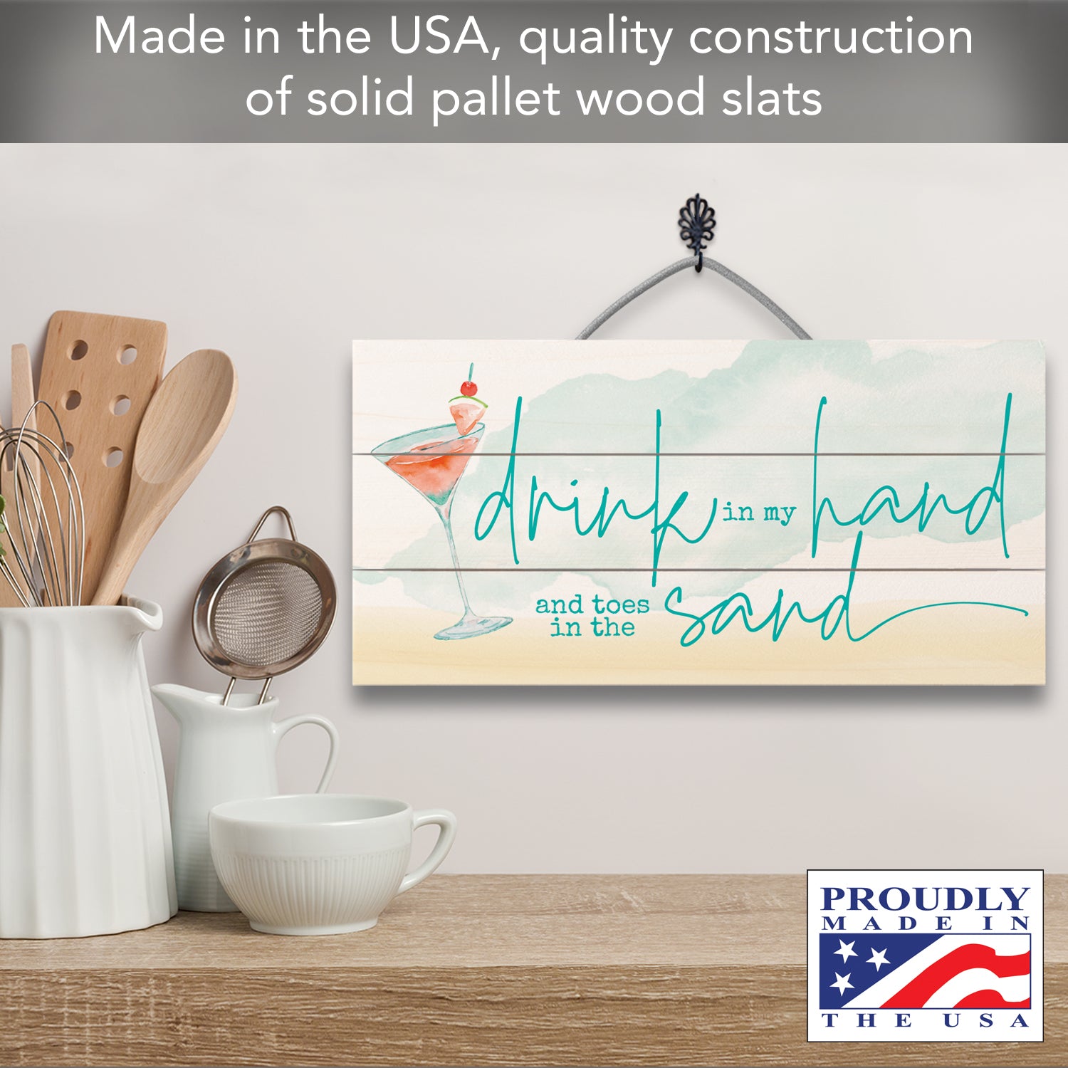 Drink in Hand Decorative Pallet Wood Sign 12" x 6" Made in the USA Wire Hanger Doubles as an Easel