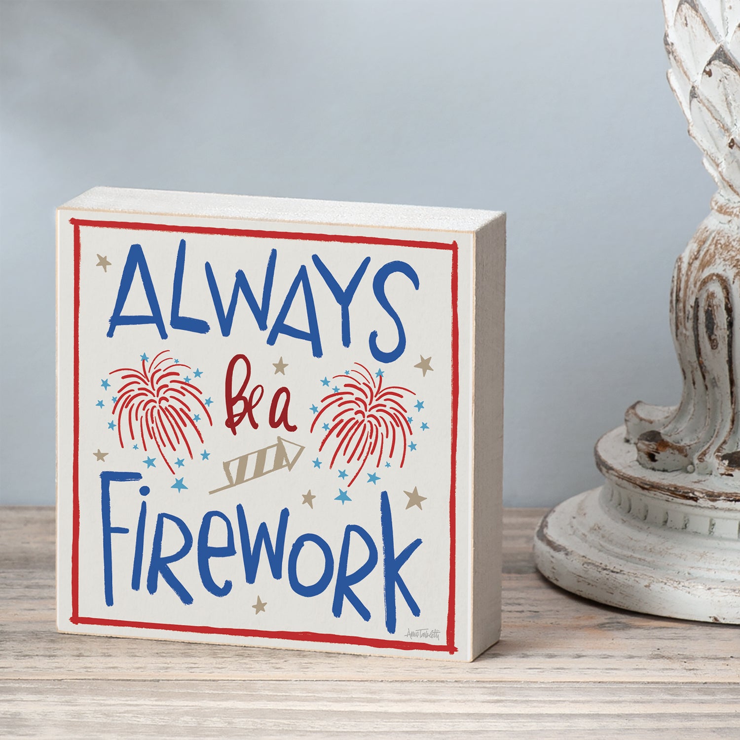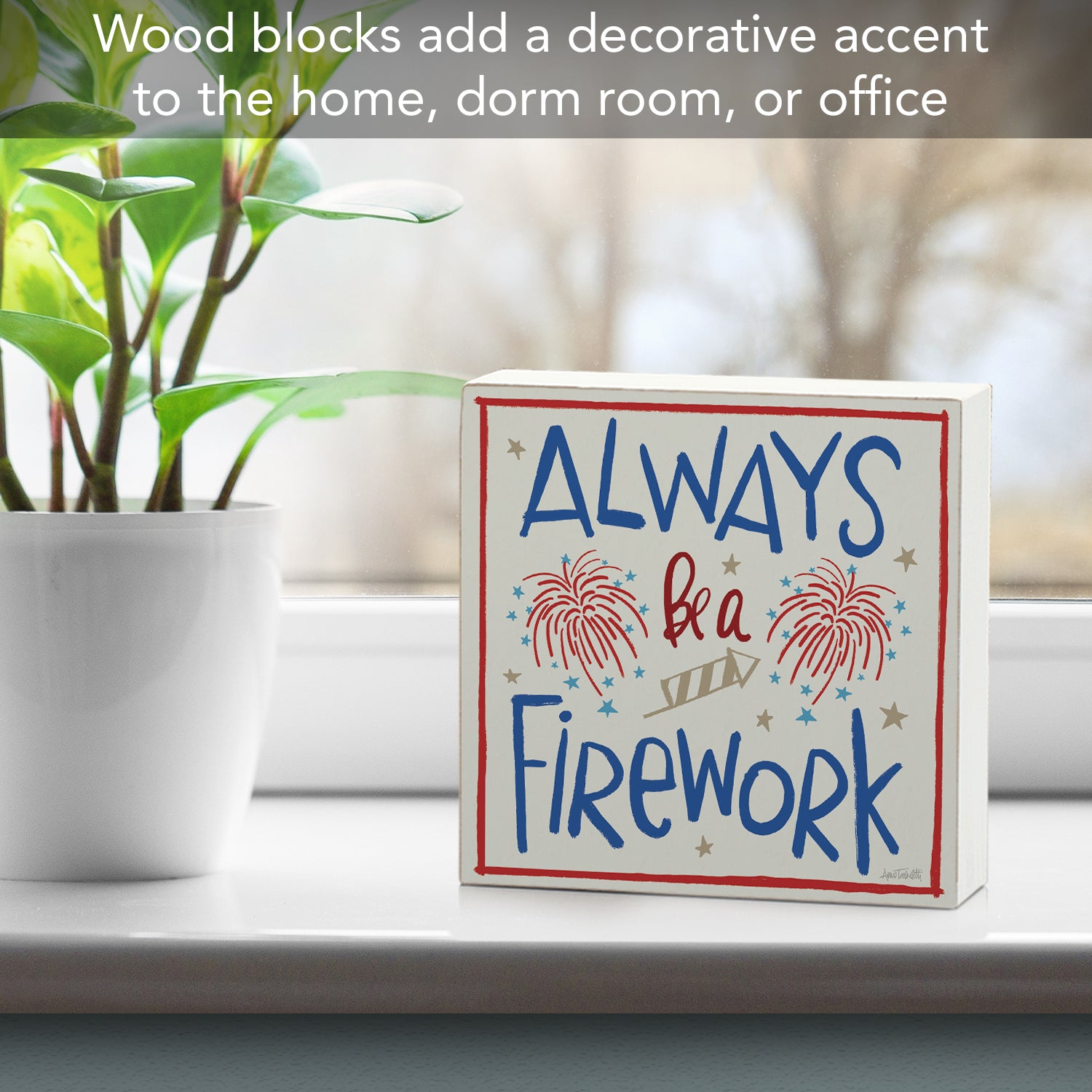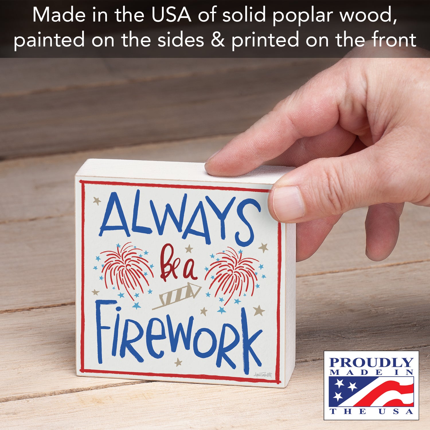 Firework Artistic Freestanding Solid Wood Block Sign Made in the USA 3.75” Square