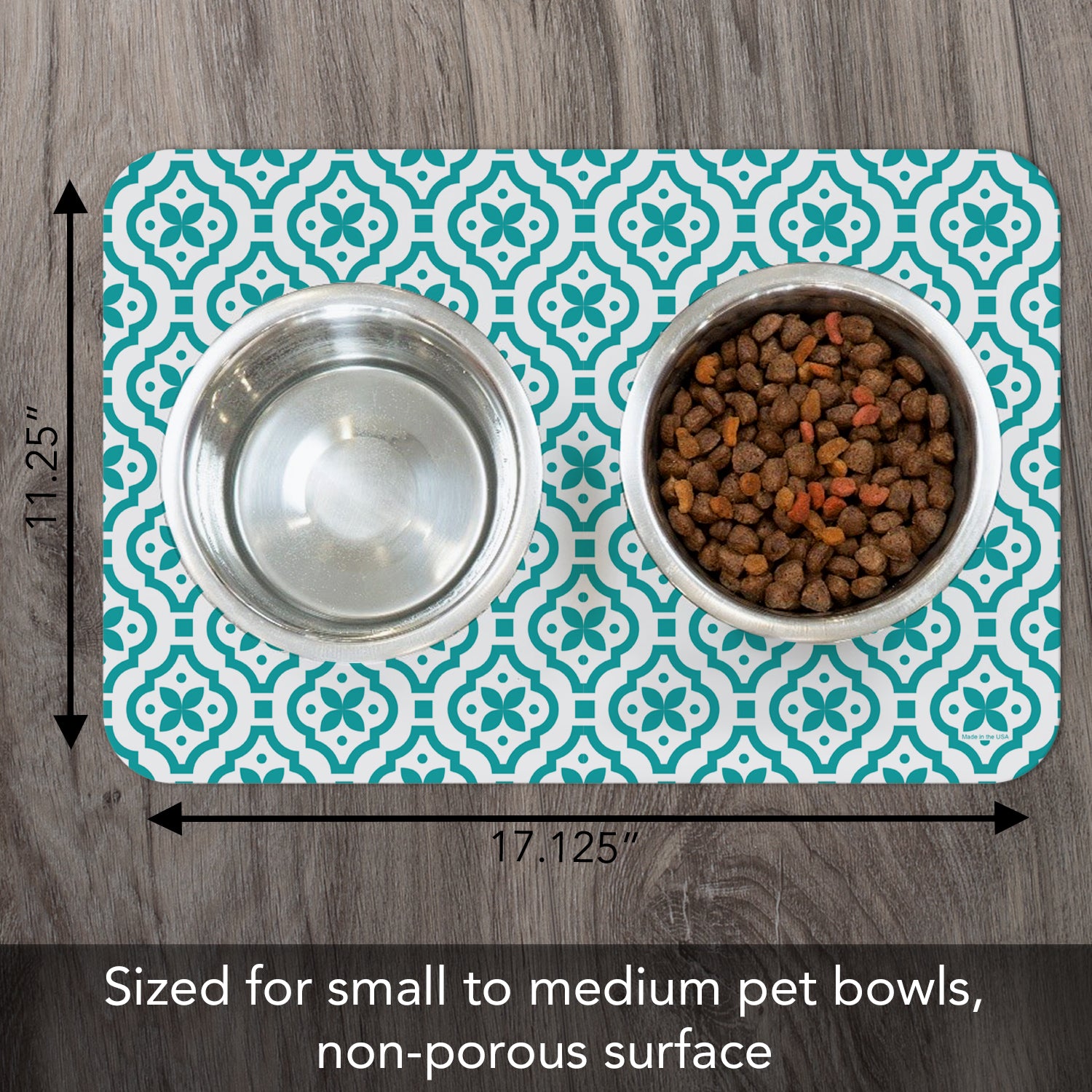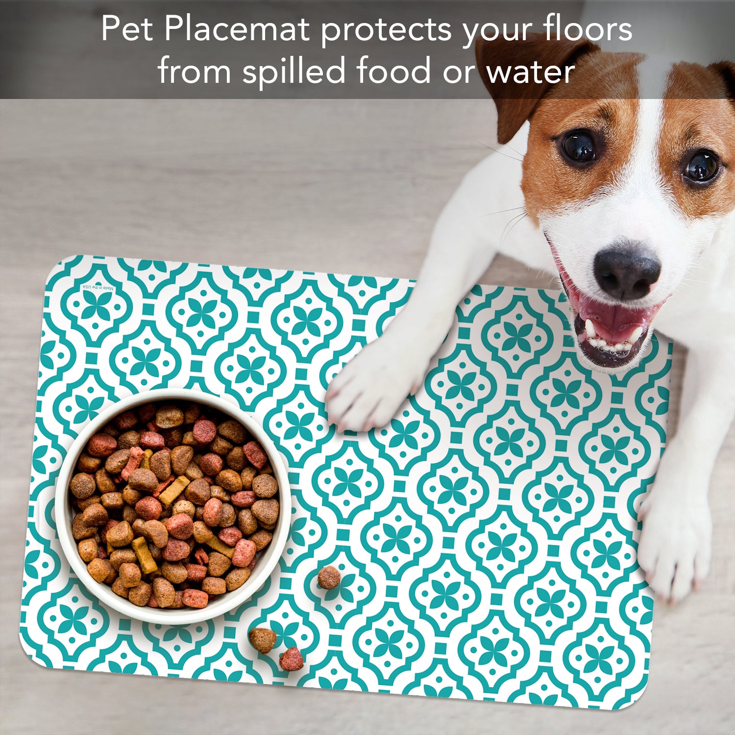 PROTECTS FLOORING-Place this decorative Pet Feeding Mat under your dog or cat’s food or water bowl to protect your floor from spilled water or food droplets. The Feeding Mat is thick enough to prevent scratches, stains, or spills from reaching your flooring.