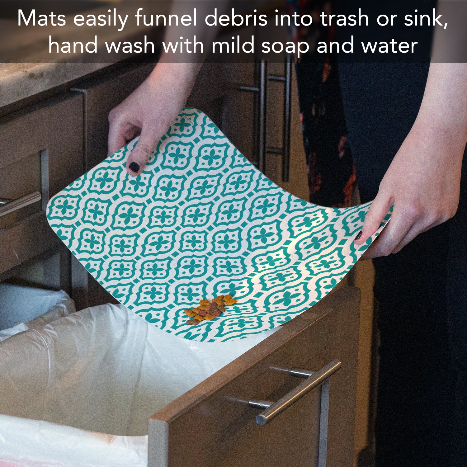 EASY CARE- Pet Feeding Mat is easy to clean, simply wash with soap and water once it becomes soiled. Flexible plastic makes it easy to transfer food scraps to the trash receptacle.