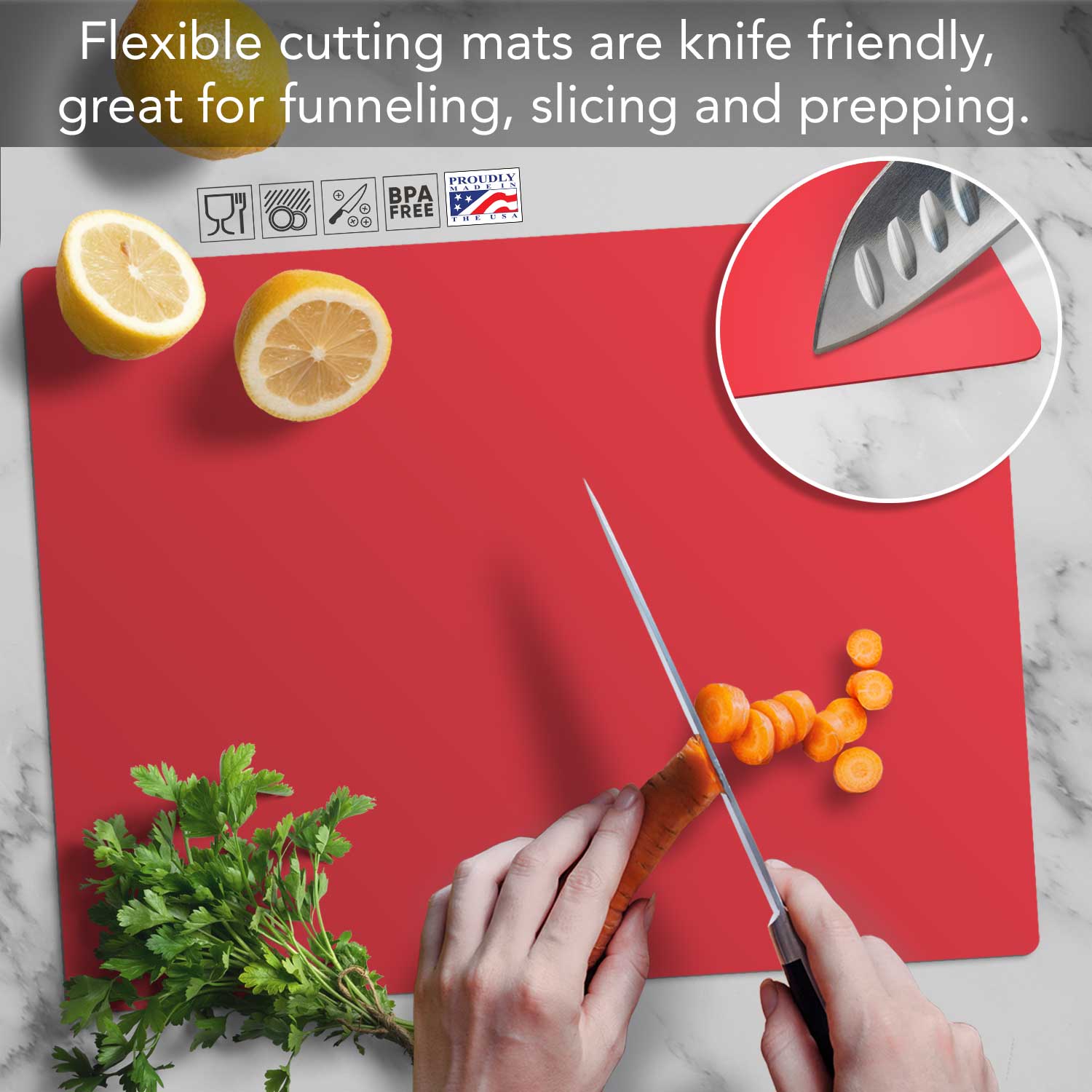 CUTTING BOARD MATS- 2-Pack Flexible Cutting Board Mats included. Made of Premium food grade, BPA & PVC free flexible plastic. Flexible plastic makes cleaning up easy. Flexible Cutting Board Mats bend easily to funnel foods into a bowl, pan, or food processor.