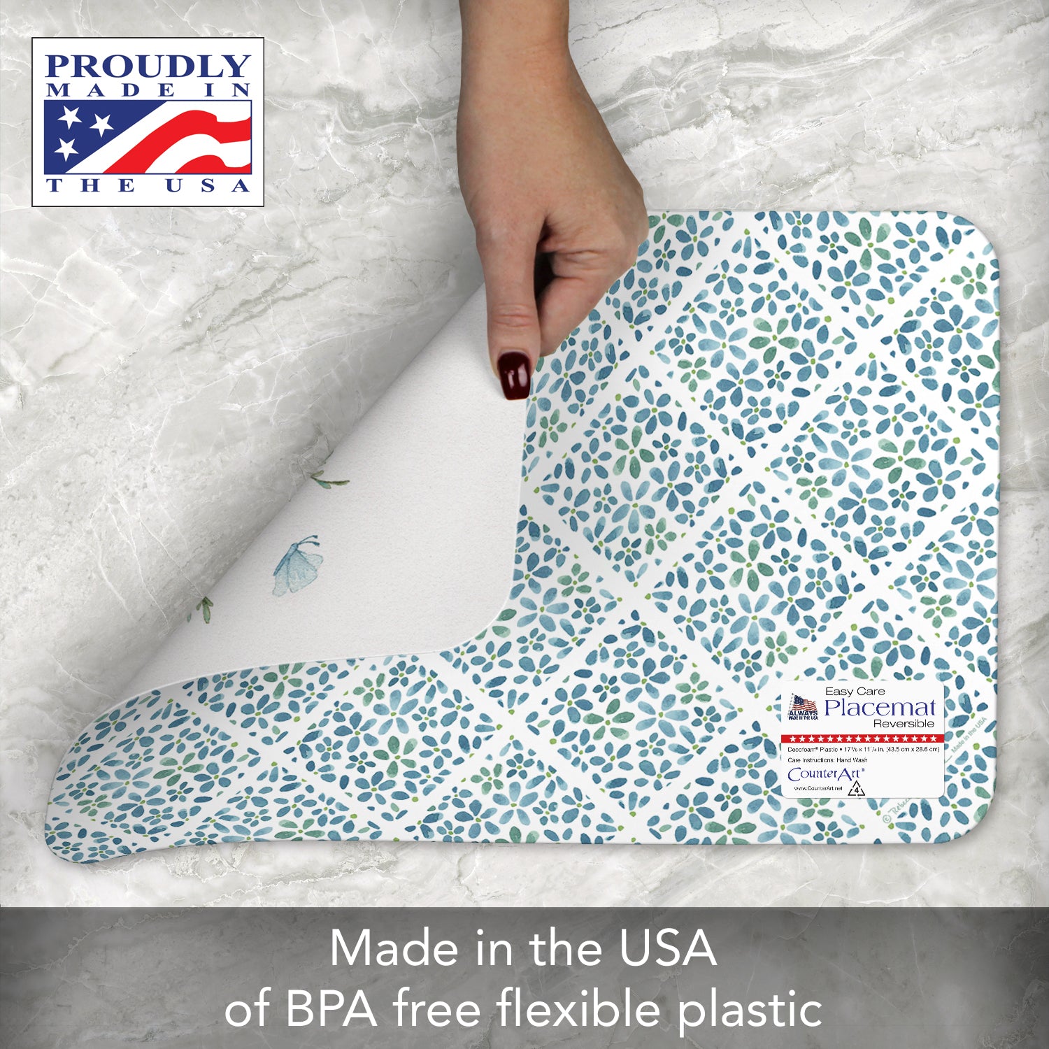 REVERSIBLE-Each Placemat features a coordinating design printed on the opposite side. Placemats are constructed of BPA and PVC free flexible plastic.