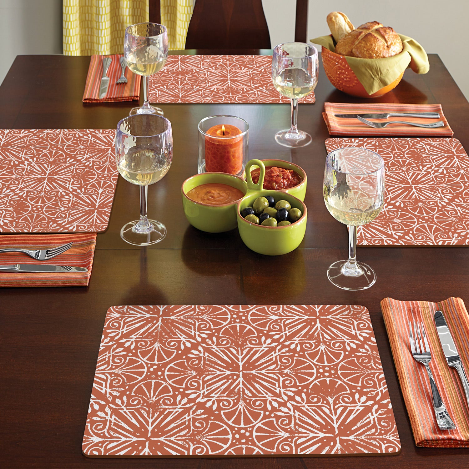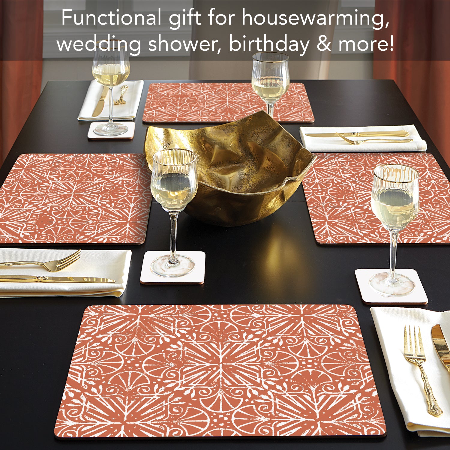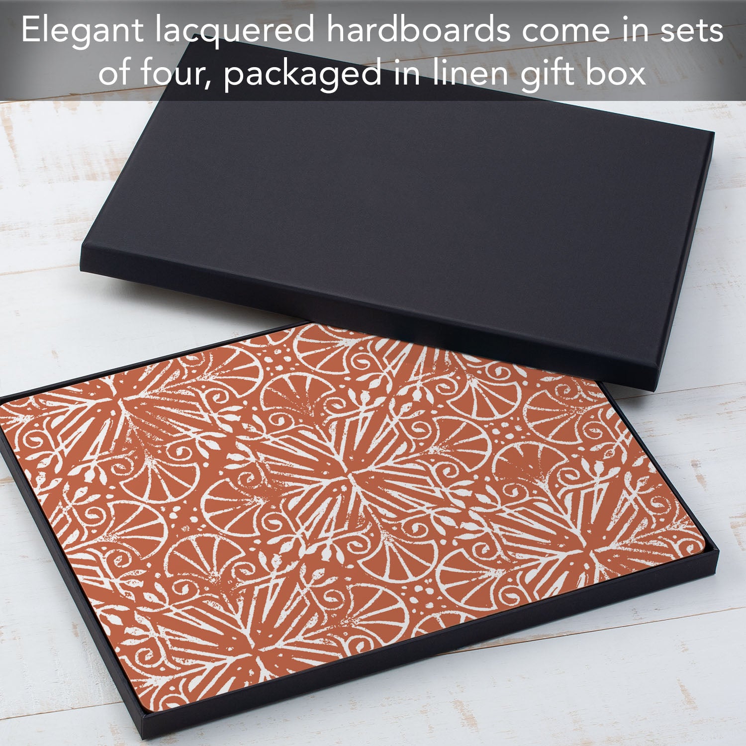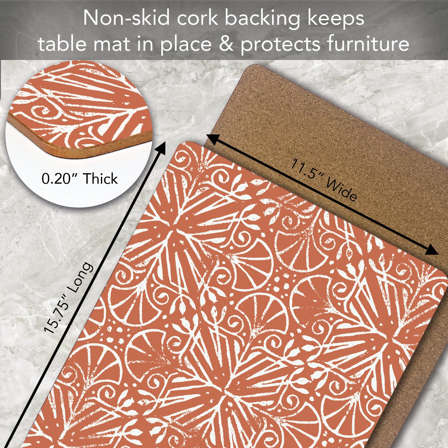 ELEGANCE- Set of 4 Decorative Placemats. Hardboard with a Cork Backing. Placemats arrive in elegant gift box that can also be used to store them. Add elegance and style to your kitchen or dining area with these functional placemats.
