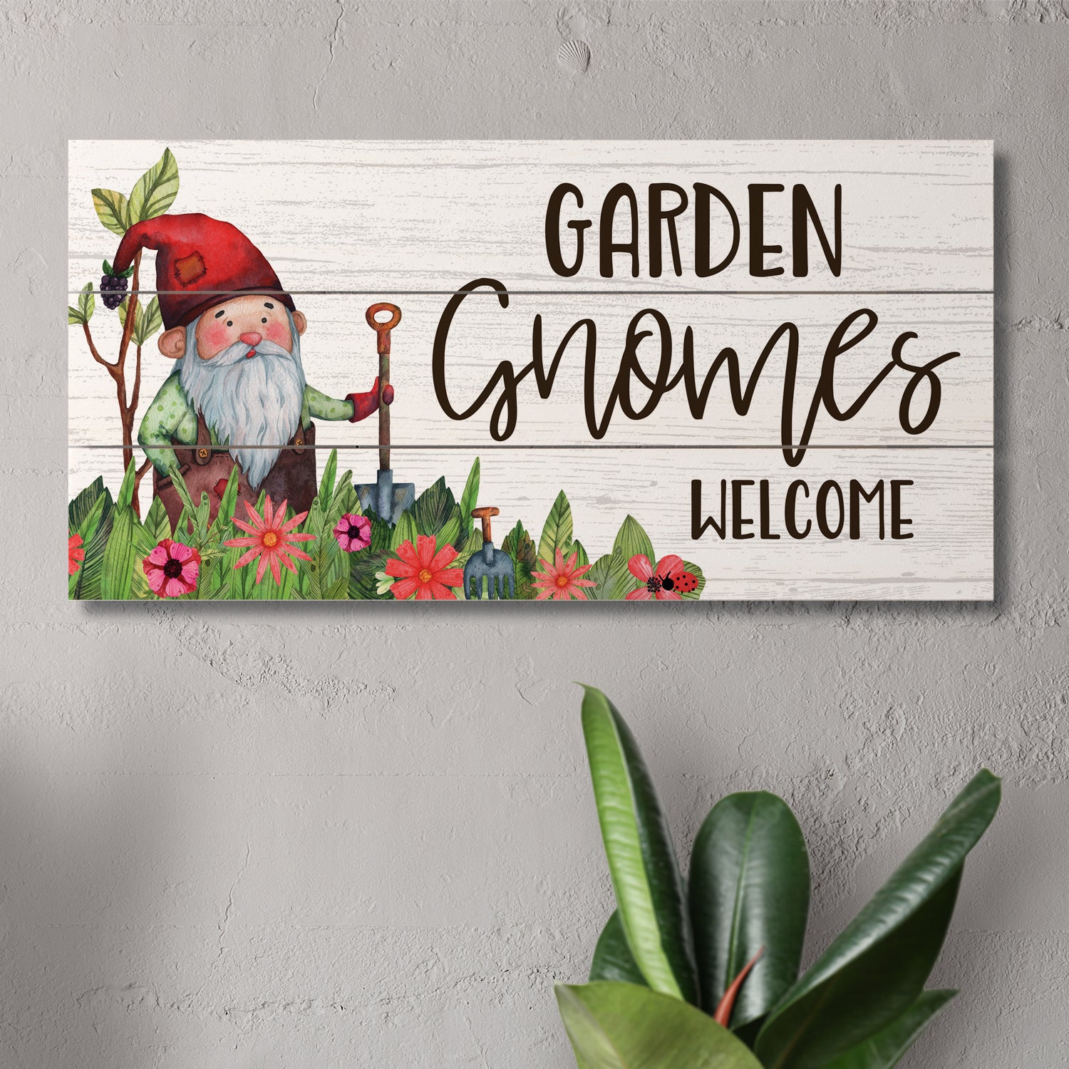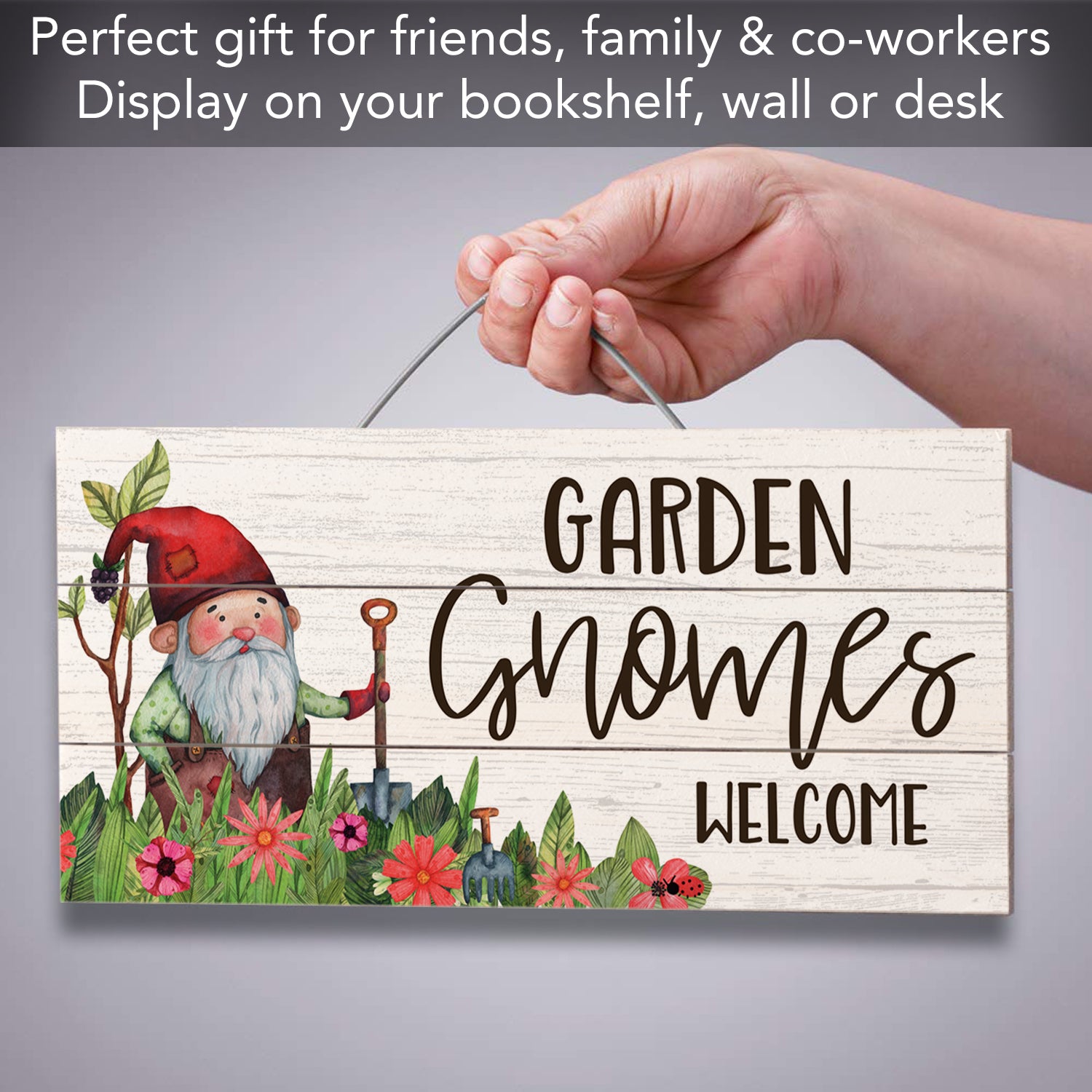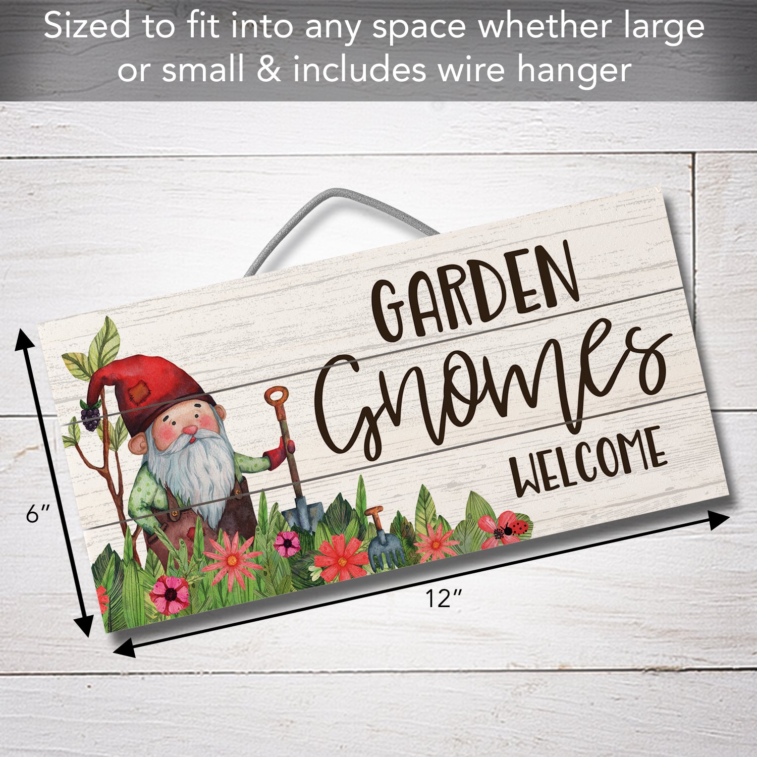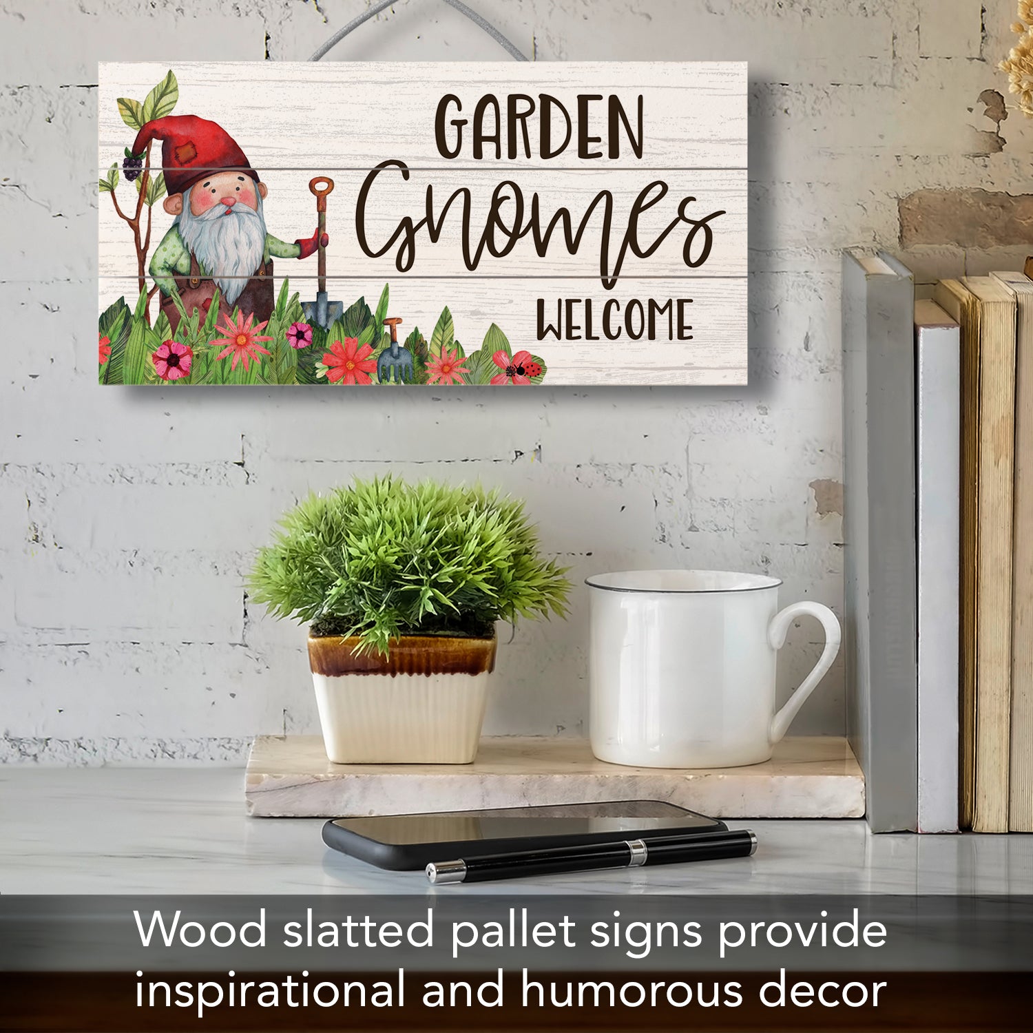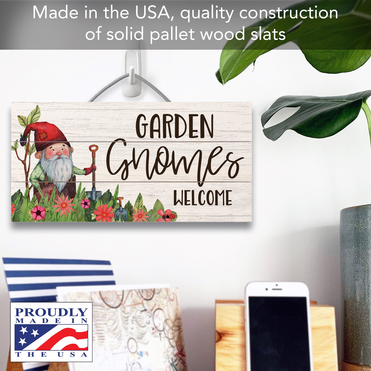 Garden Gnomes Decorative Slatted Pallet Wood Sign 12" by 6" Made in the USA Wire Hanger Doubles as an Easel