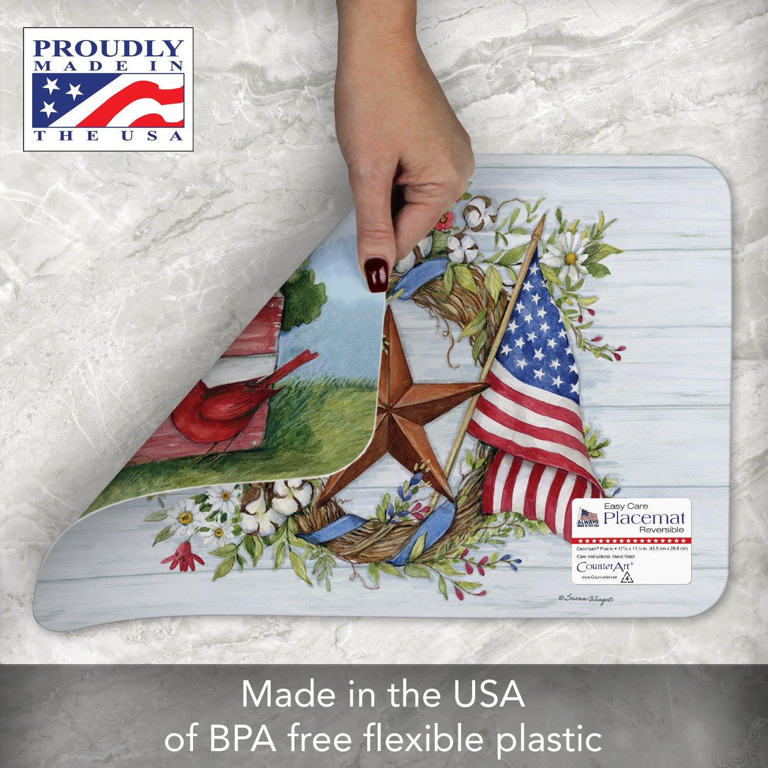 REVERSIBLE-Each Placemat features a coordinating design printed on the opposite side. Placemats are constructed of BPA and PVC free flexible plastic.