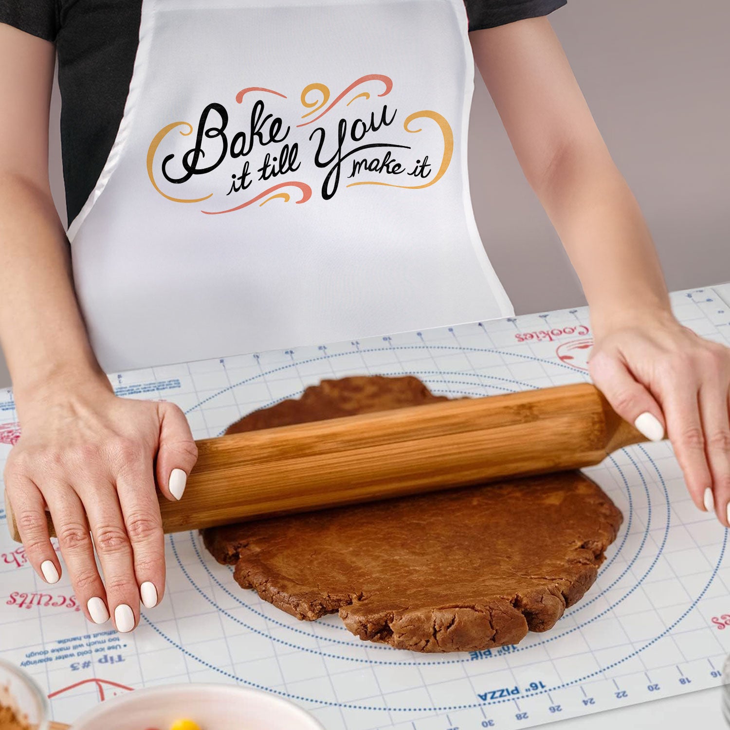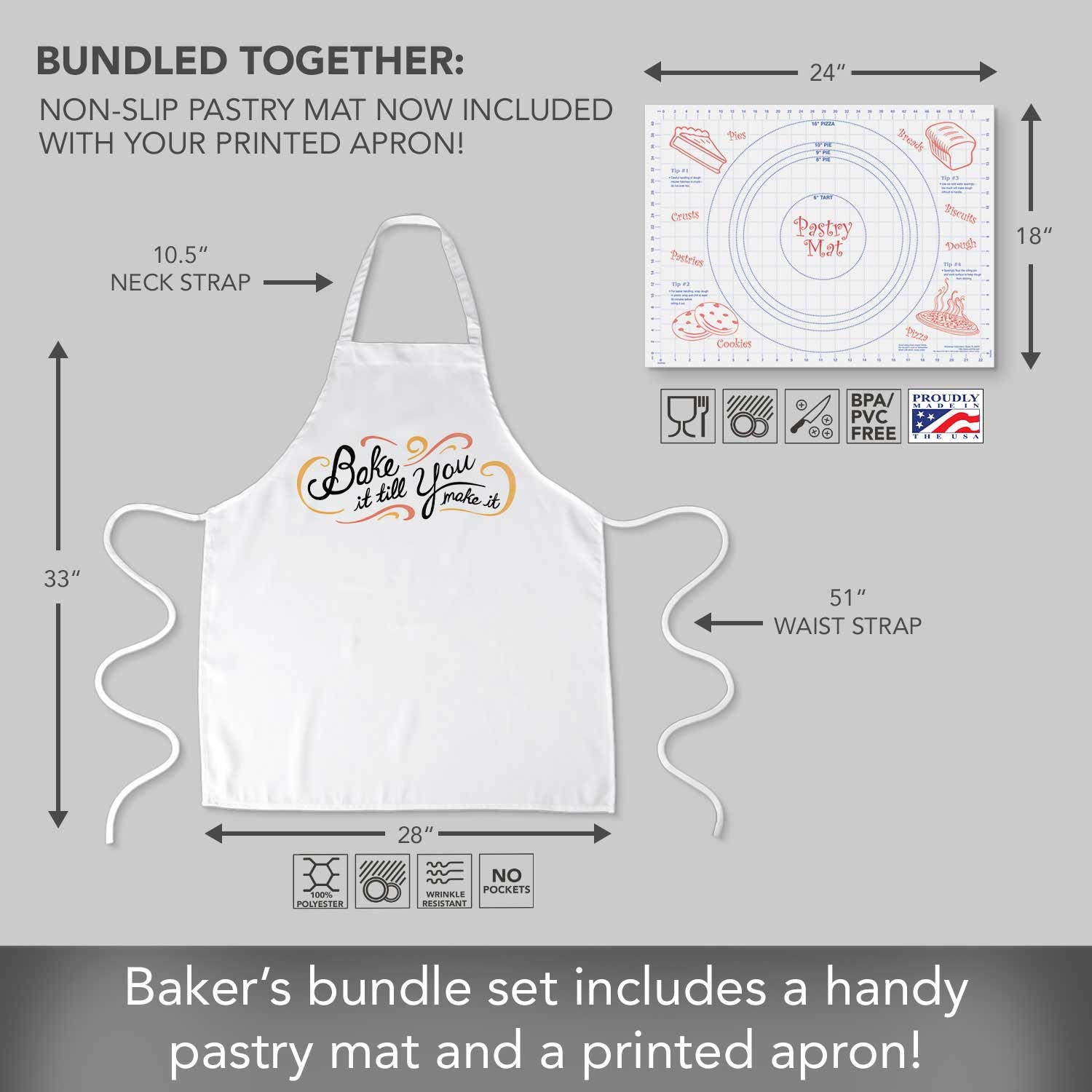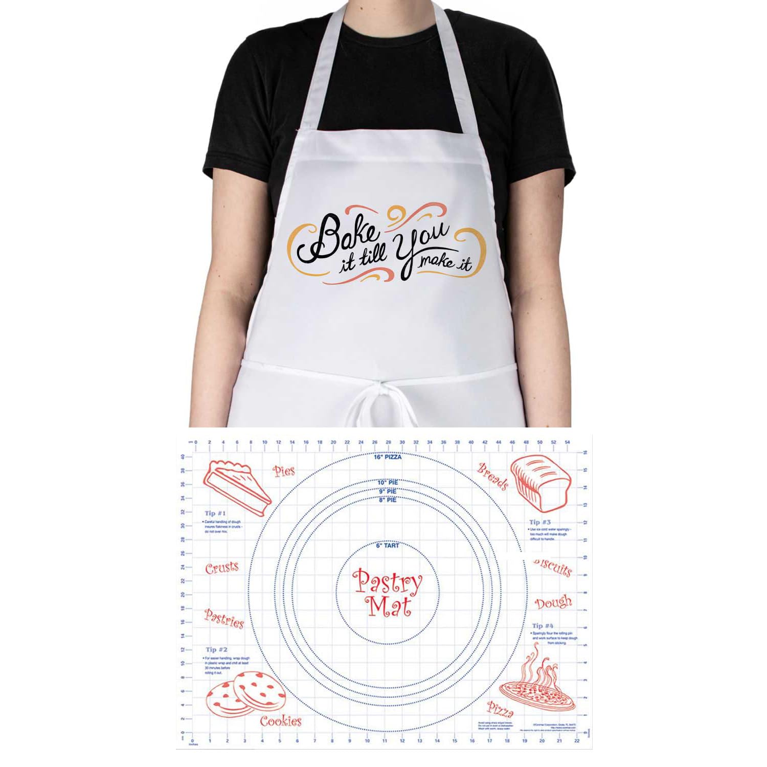 MEASURES- Apron measures 33” x 28”. Straps are 10.5”. Waist straps are 51”, making this apron a one size fits all item. Pastry Mat measures 24” x 18”.