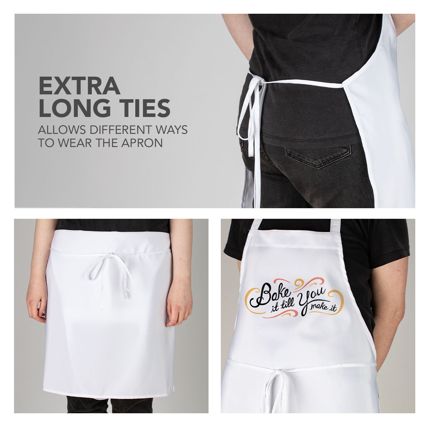 APRON CONSTRUCTION-Apron is constructed of spun polyester that is soft to the touch. Material is washable and quick drying. Aprons are moisture-wicking and tear resistant. Material is lightweight so it can be worn on hot days outside. Extra-long ties allow the aprons to be worn multiple ways
