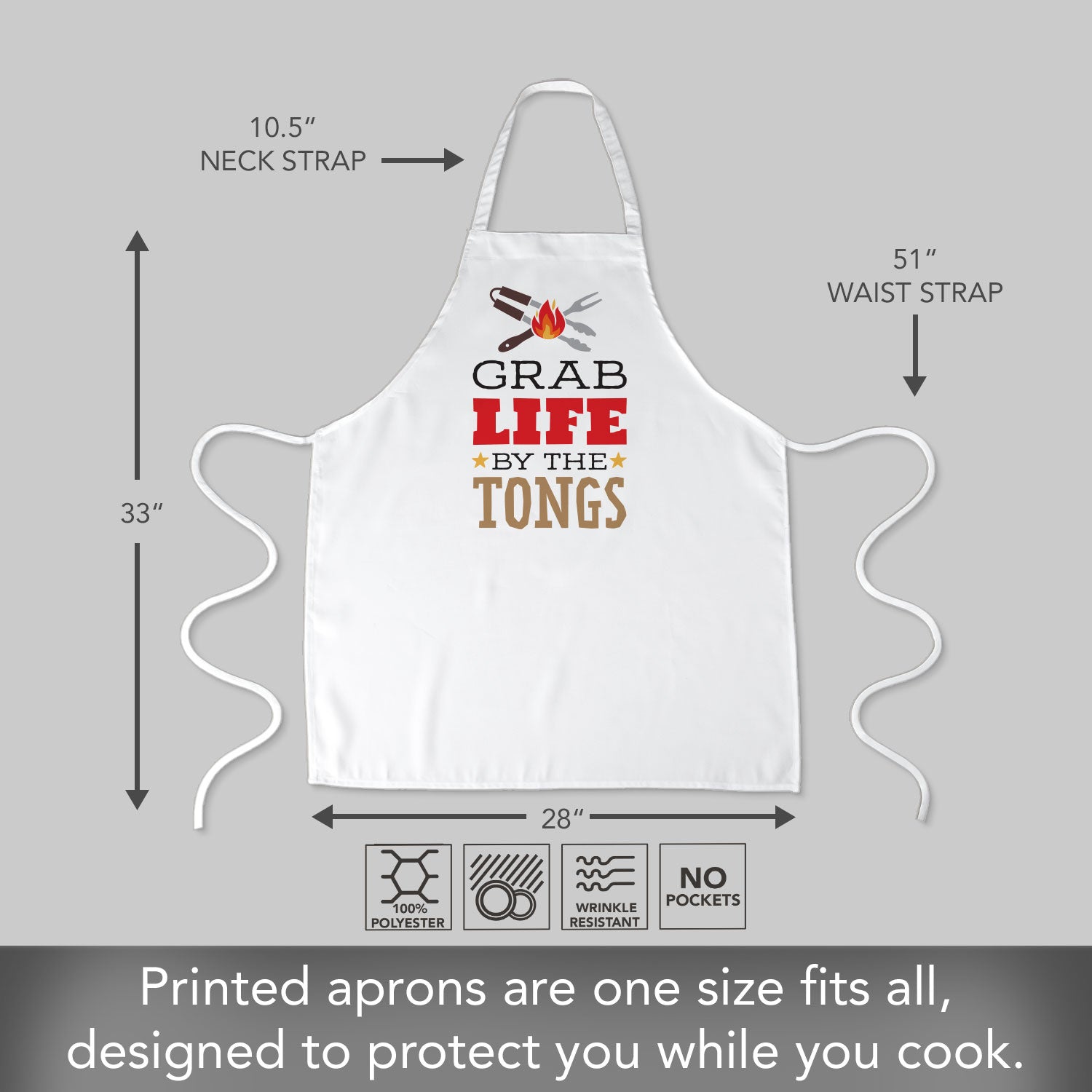 MEASURES-Apron measures 33” x 28”. Straps are 10.5”. Waist straps are 51”, making this apron a one size fits all item.