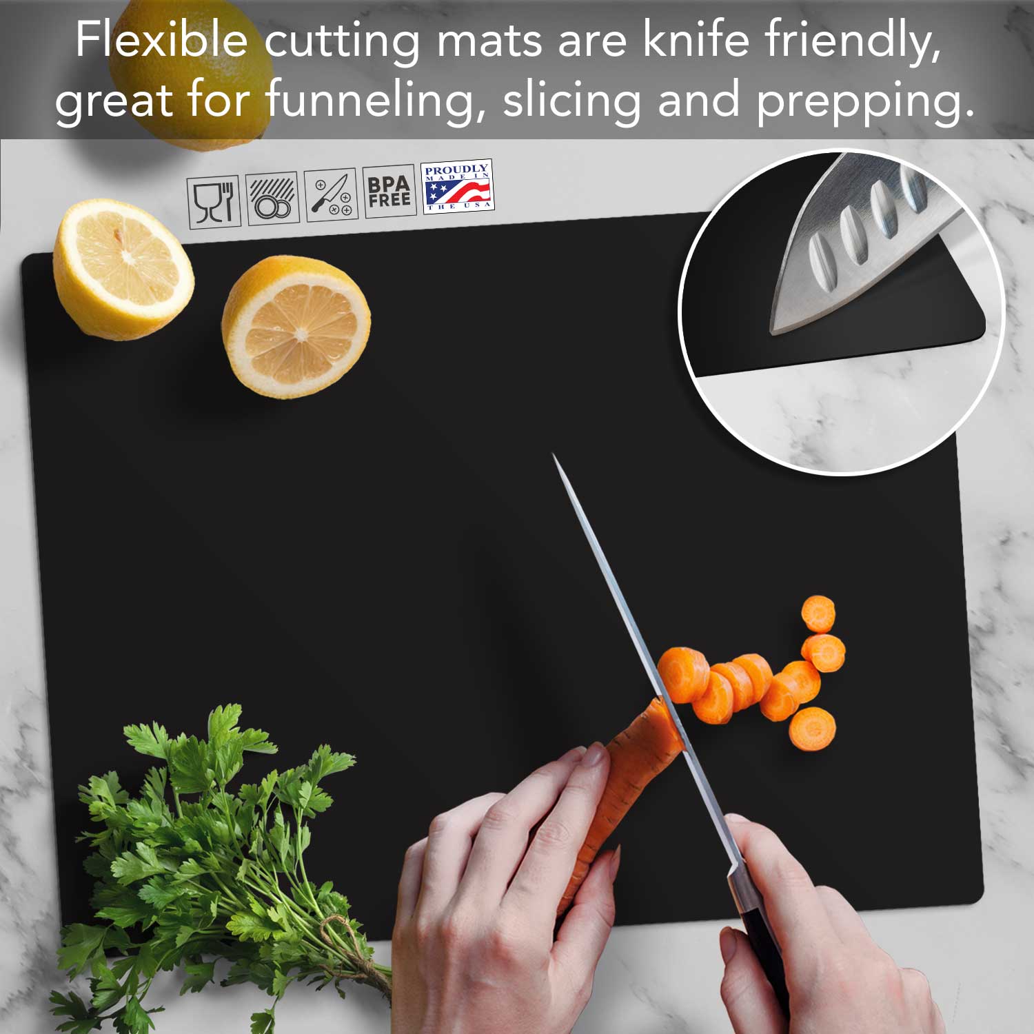 CUTTING BOARD MATS- 2-Pack Flexible Cutting Board Mats included. Made of Premium food grade, BPA & PVC free flexible plastic. Flexible plastic makes cleaning up easy. Flexible Cutting Board Mats bend easily to funnel foods into a bowl, pan, or food processor.