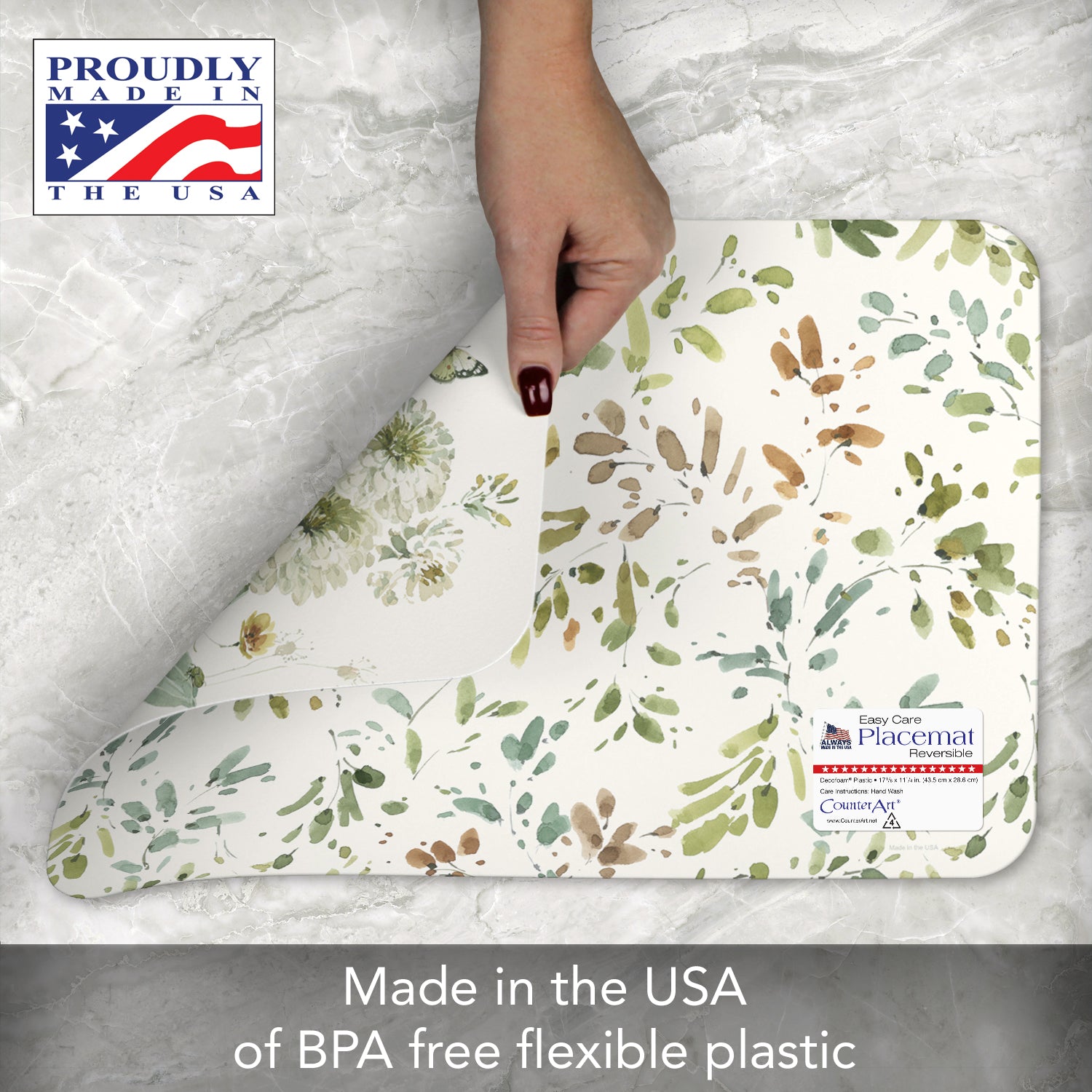 REVERSIBLE-Each Placemat features a coordinating design printed on the opposite side. Placemats are constructed of BPA and PVC free flexible plastic.