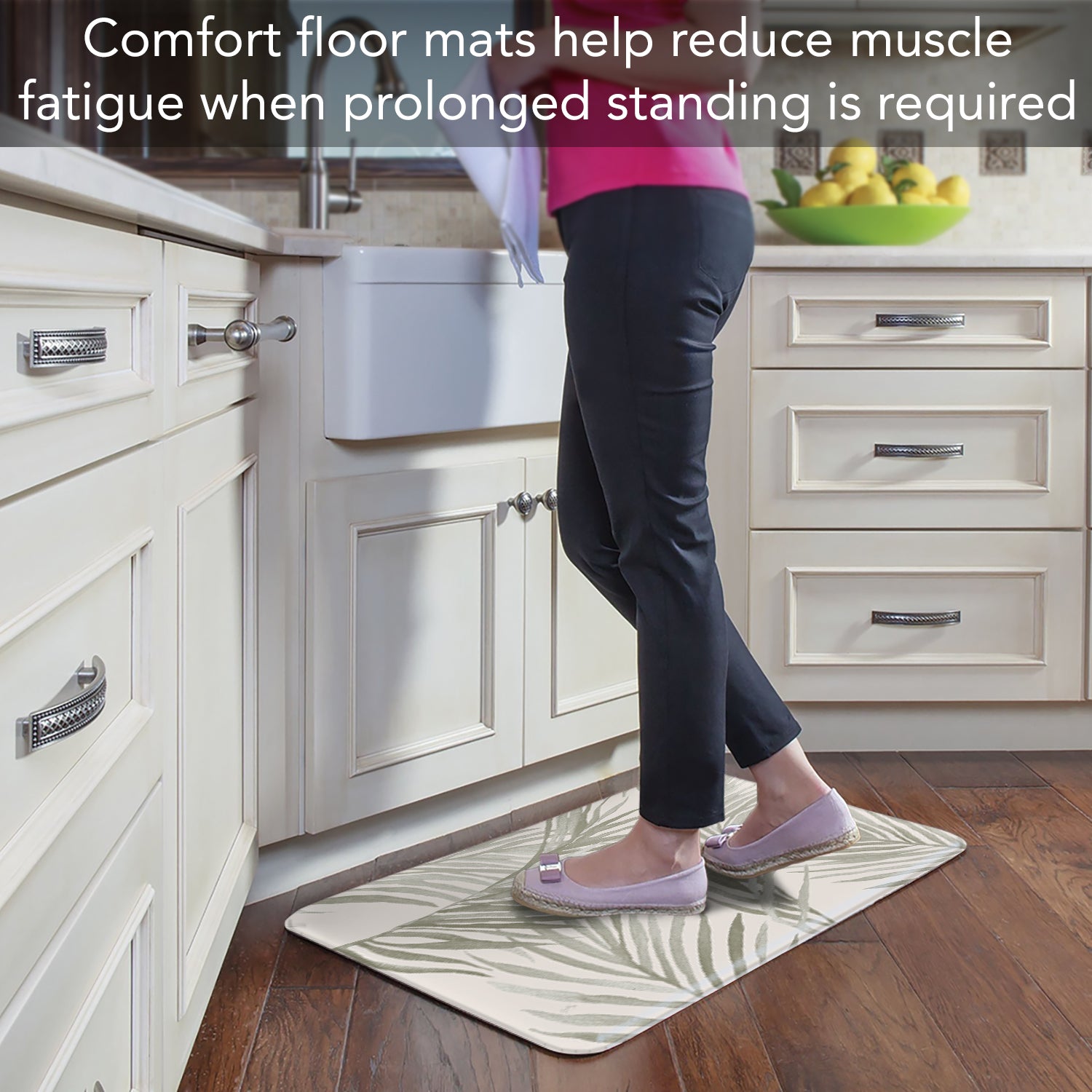 ALL FLOOR TYPES-Vinyl textured backing allows the Floor Mat to be placed on any type of floor, whether it be tile, wood, or carpet. These Comfort Mats are easy to maintain. Wipe with damp cloth or spray off lightly with garden hose and lay flat to dry.