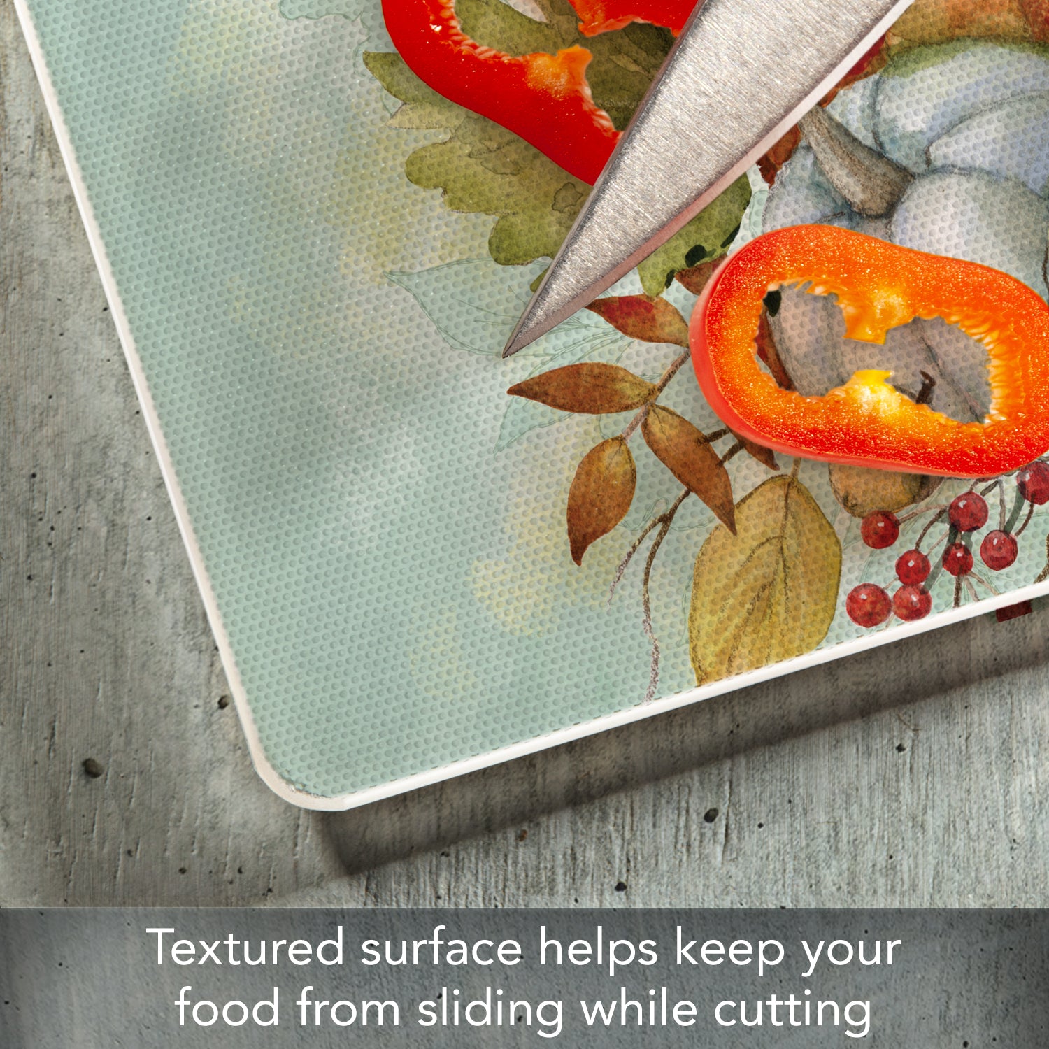 - FEATURES- Surface of Cutting Board is slightly textured to help keep foods stable as they are being chopped and diced. Rubber Non-Skid feet on bottom of the board protects your surfaces from scratches and stains.