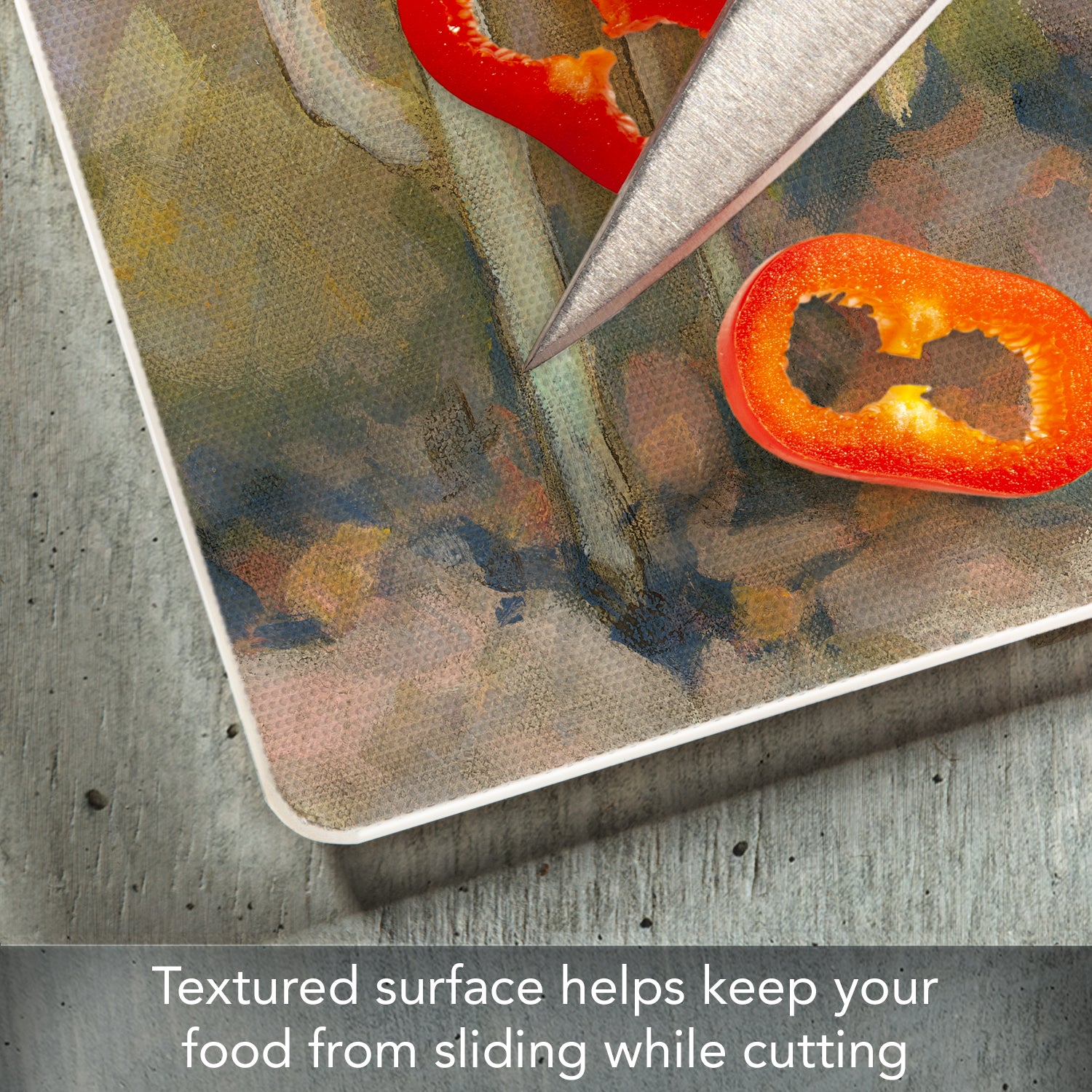 - FEATURES- Surface of Cutting Board is slightly textured to help keep foods stable as they are being chopped and diced. Rubber Non-Skid feet on bottom of the board protects your surfaces from scratches and stains.