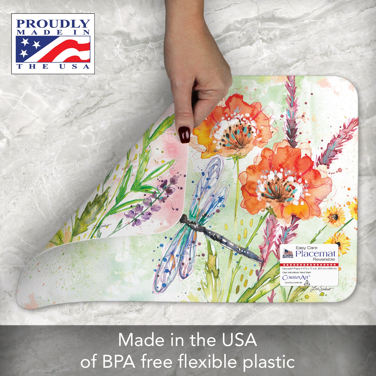 REVERSIBLE-Each Placemat features a coordinating design printed on the opposite side. Placemats are constructed of BPA and PVC free flexible plastic.