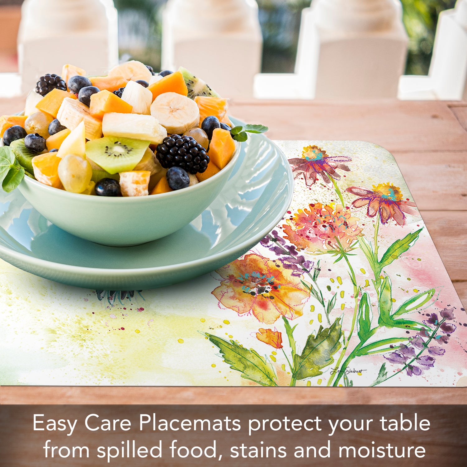 EASY CARE-Placemats can easily be wiped clean with soap and water. The flexibility of these Placemats makes for easy clean up. Easily funnel crumbs or meal remnants from the table to the trash receptacle.